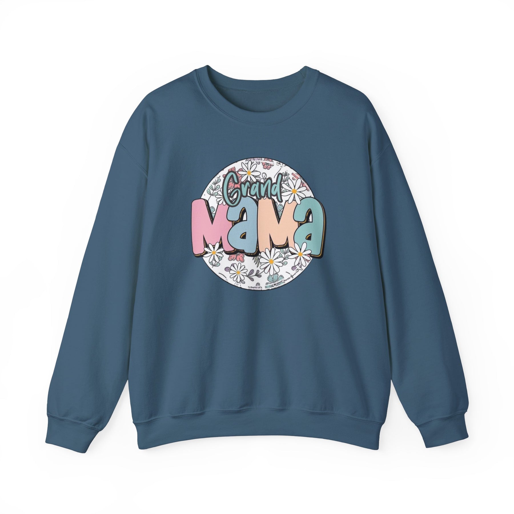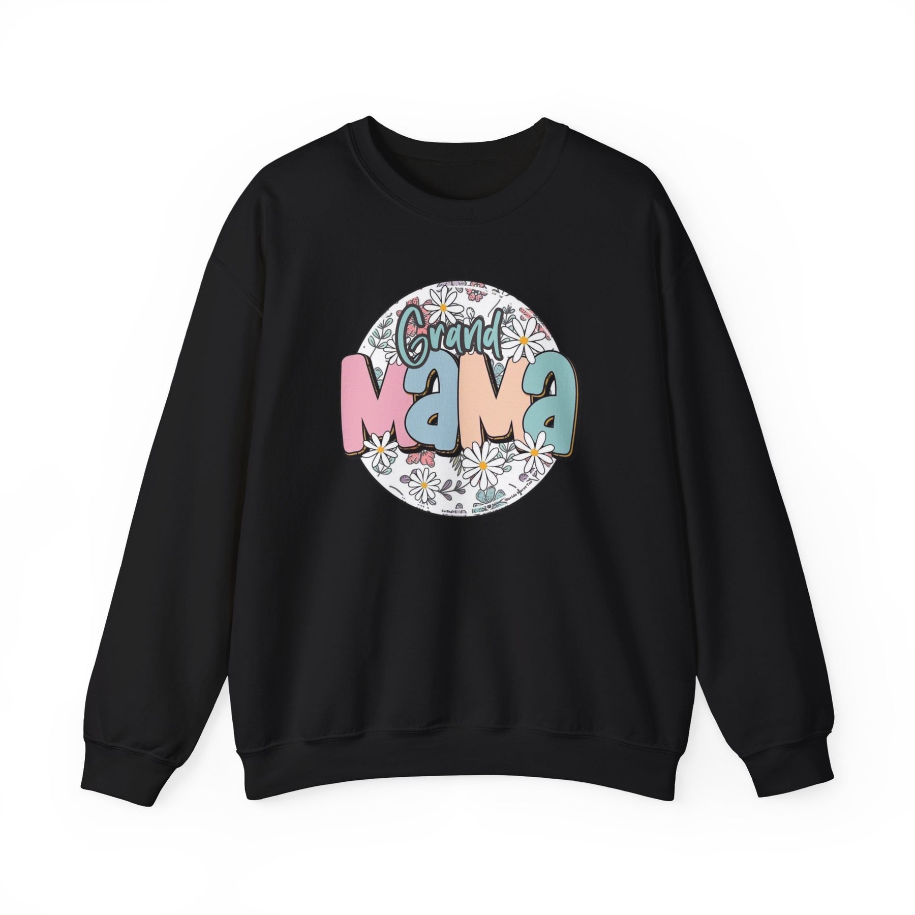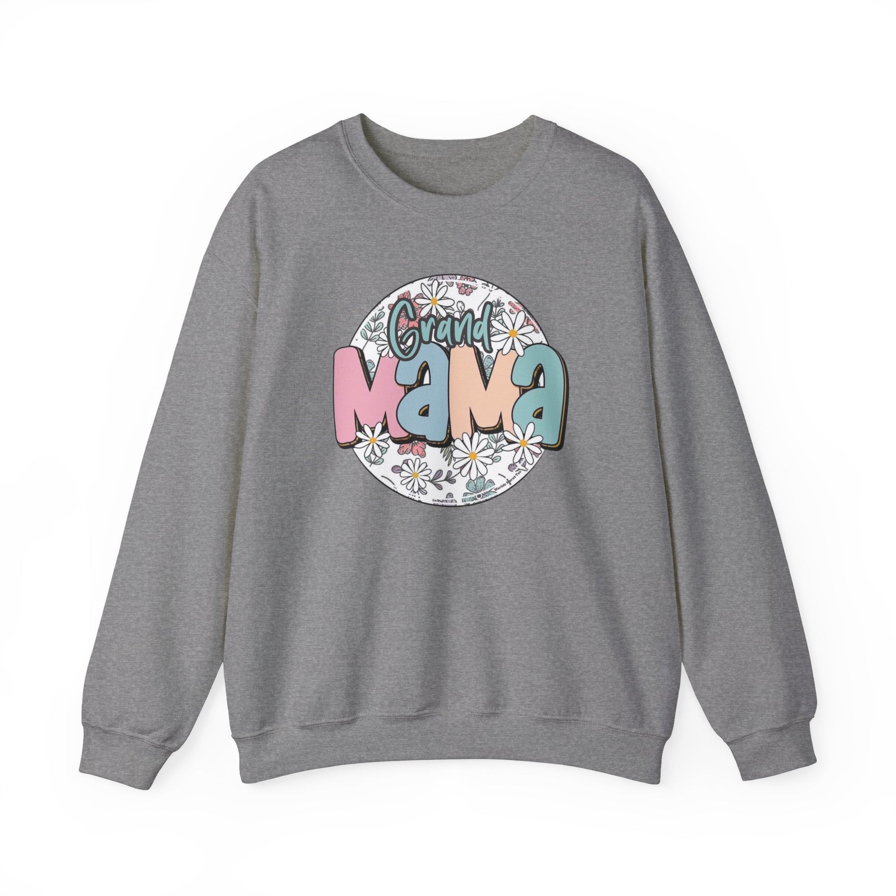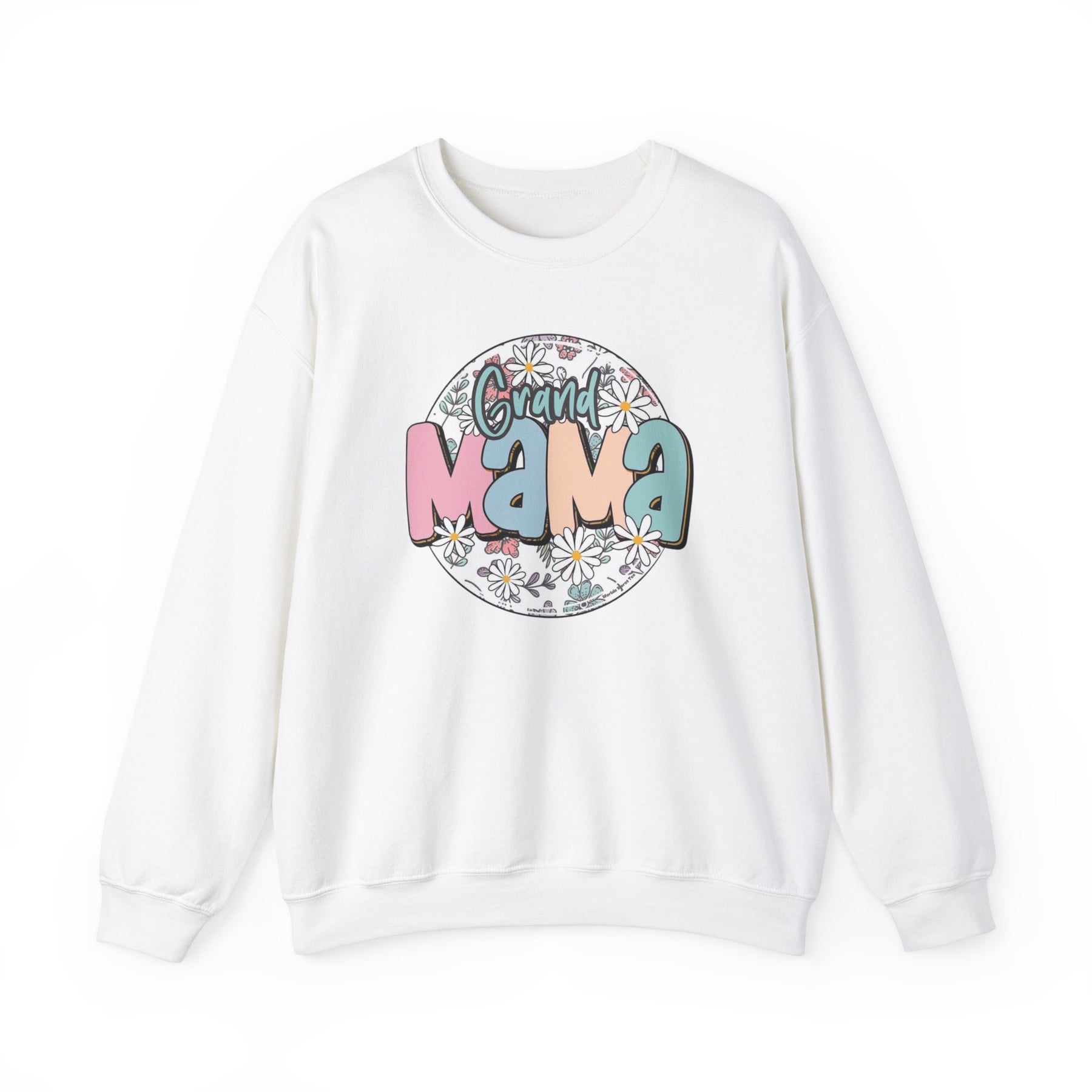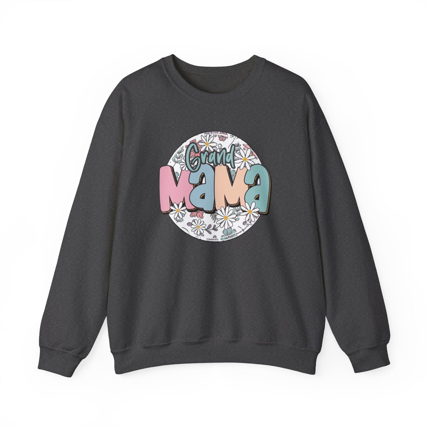 A unisex heavy blend crewneck sweatshirt featuring a white circle with colorful text, ideal for any occasion. Sassy Grand Mama Flower Crew: 50% cotton, 50% polyester, medium-heavy fabric, loose fit, ribbed knit collar.