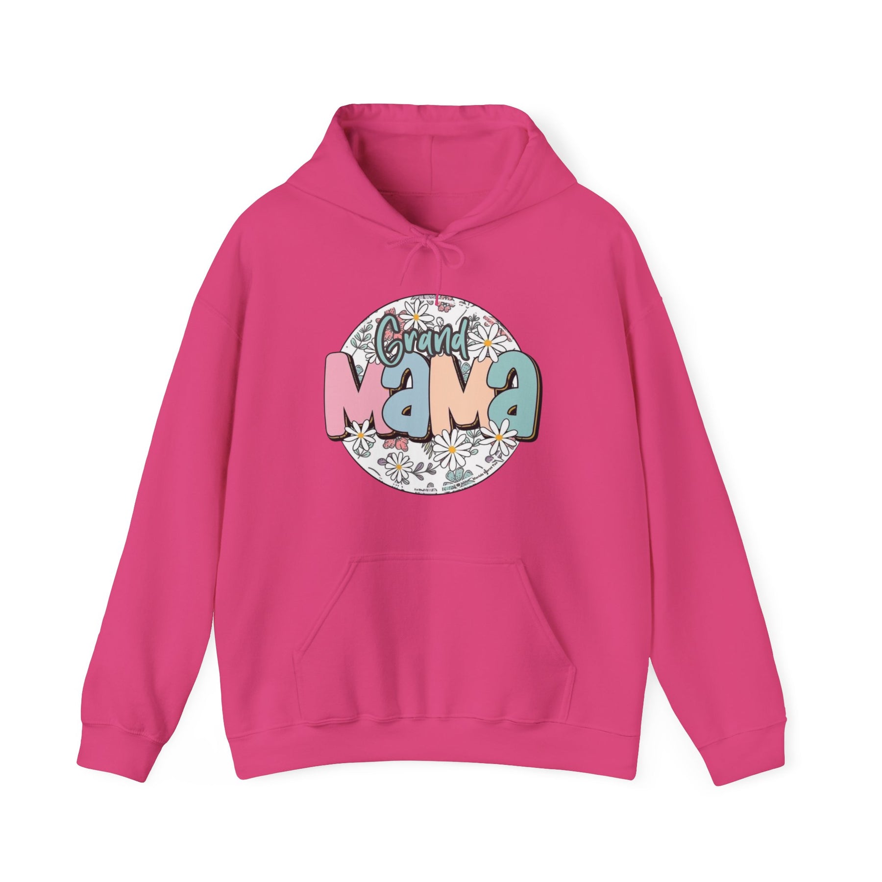 A grey hooded sweatshirt featuring a white circle with colorful text, embodying comfort and style. Unisex heavy blend of cotton and polyester, with a kangaroo pocket and matching drawstring. Sassy Grand Mama Flower Hoodie by Worlds Worst Tees.