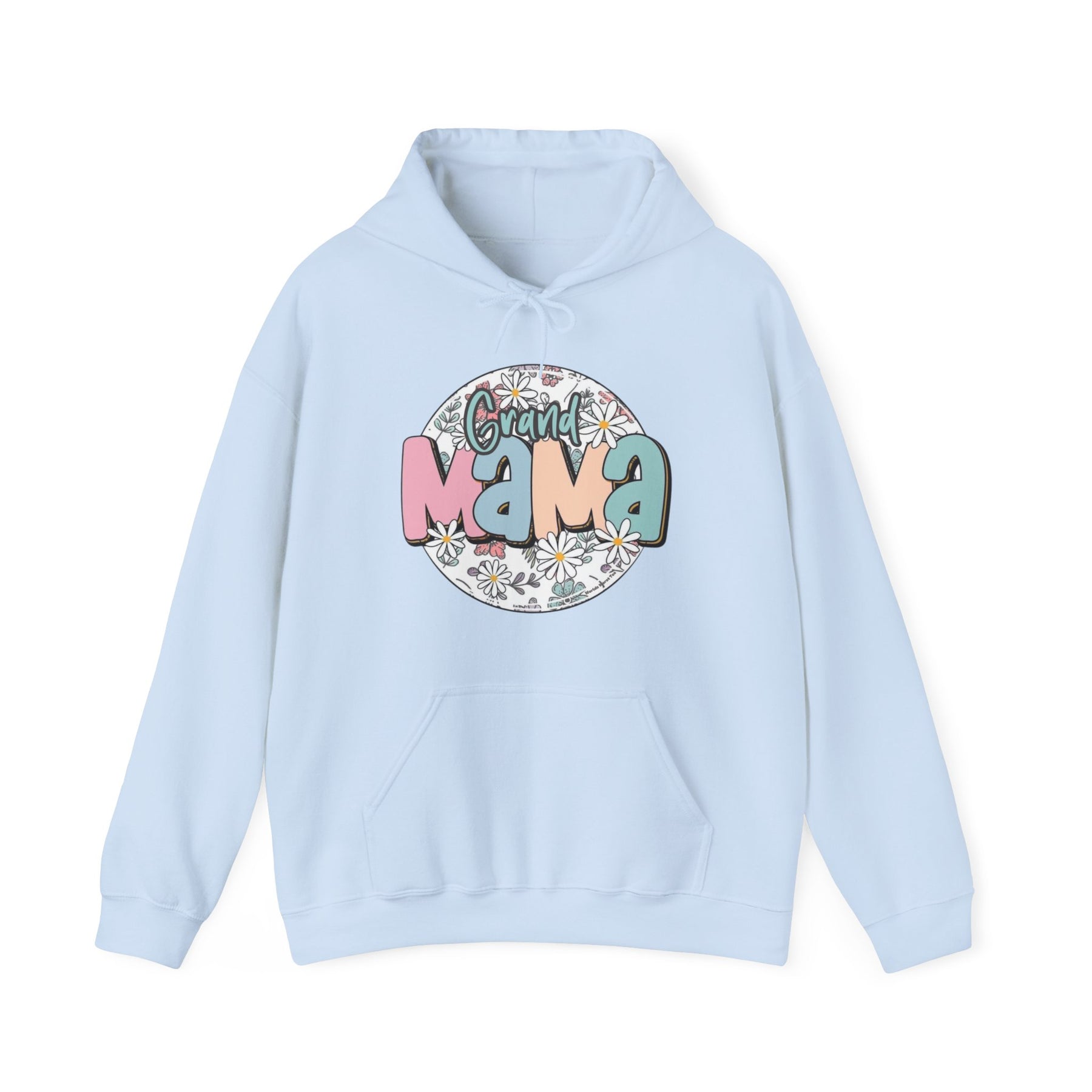 A light blue Sassy Grand Mama Flower Hoodie, a cozy unisex blend of cotton and polyester. Features a kangaroo pocket and matching drawstring hood. Ideal for chilly days.