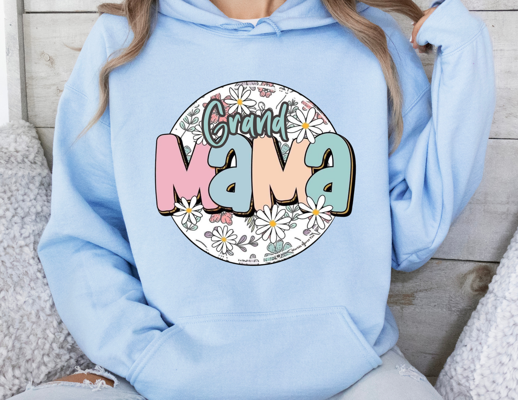 A person in a blue hoodie with a kangaroo pocket, showcasing the Sassy Grand Mama Flower Hoodie from Worlds Worst Tees. Made of cotton and polyester, cozy for cold days. Sizes from S to 5XL.