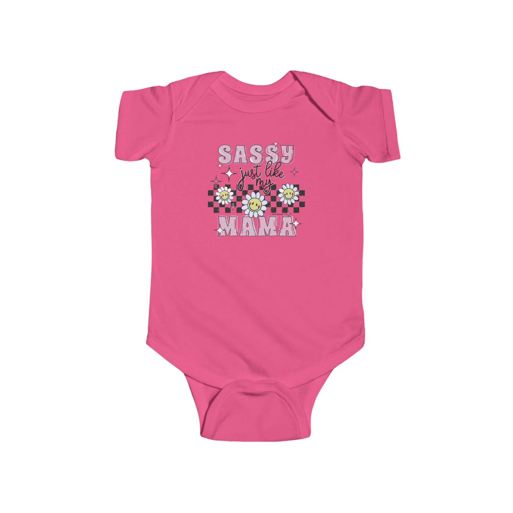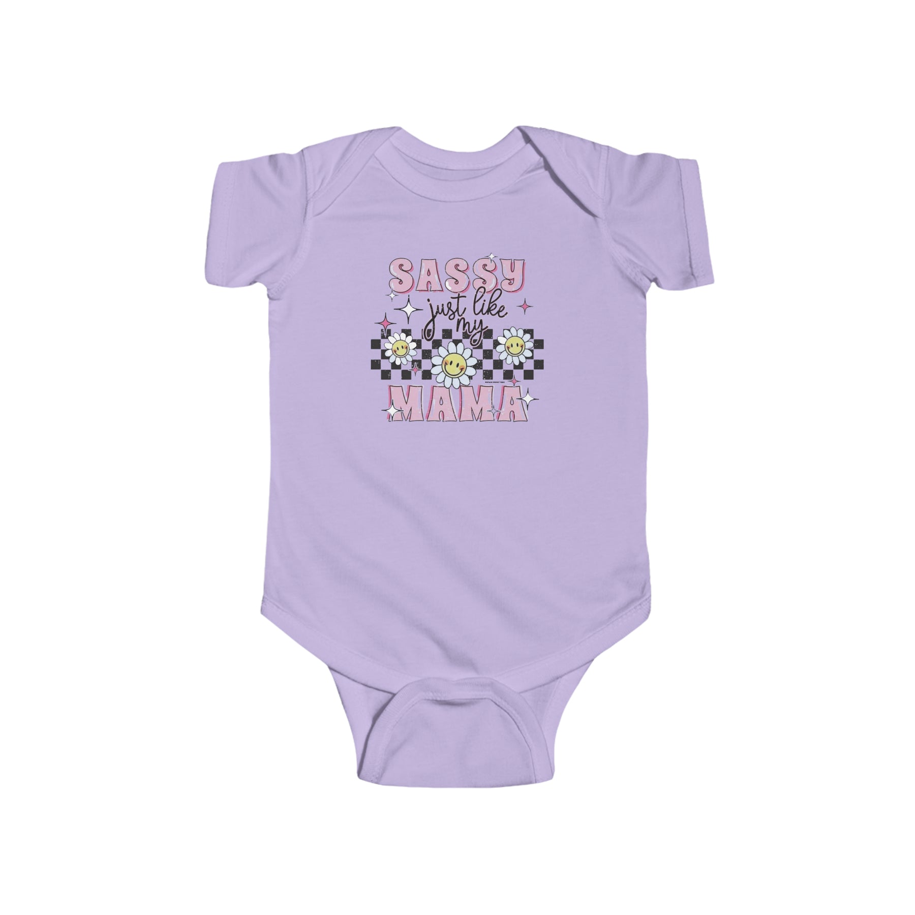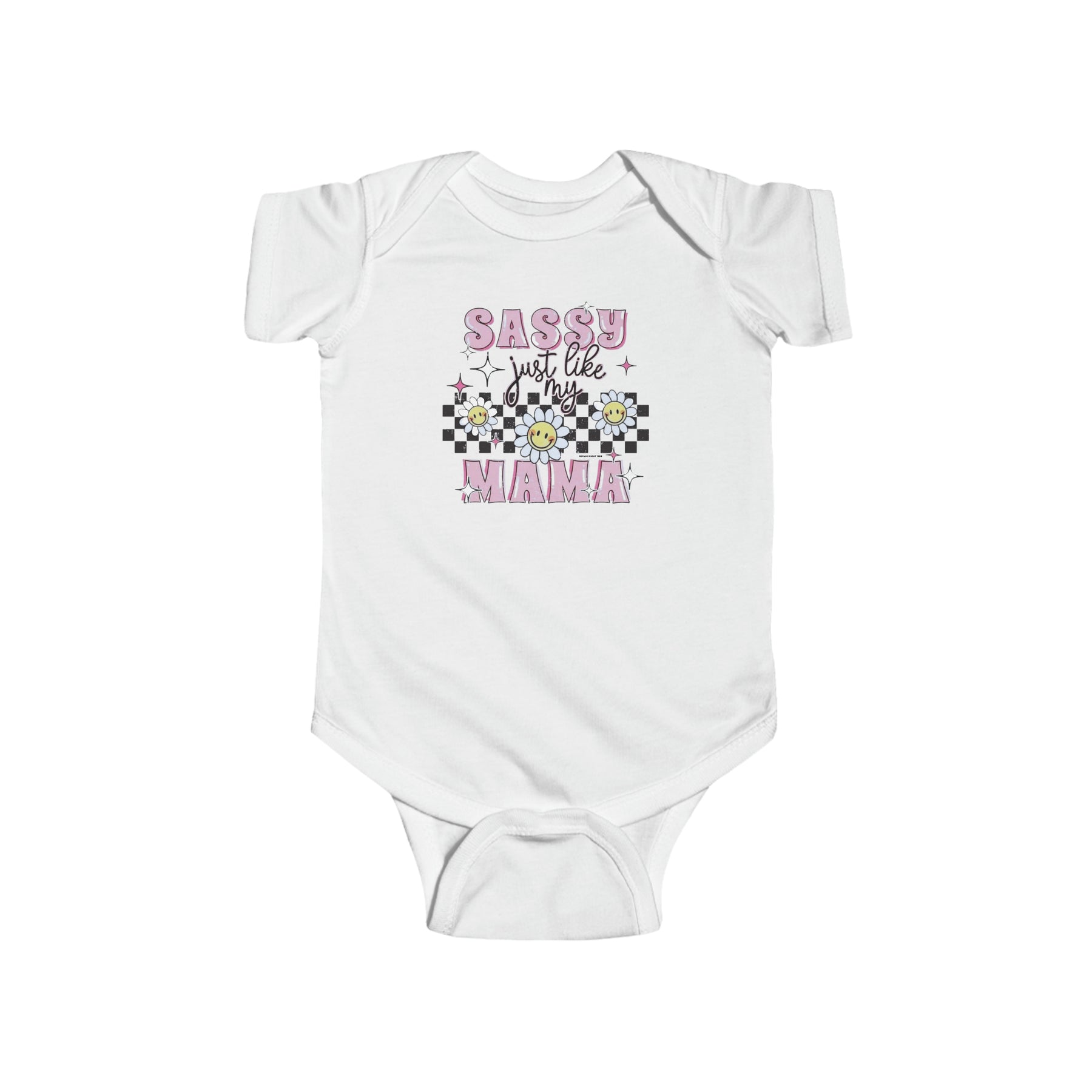 A playful infant fine jersey bodysuit featuring a whimsical design of flowers, stars, and text. Crafted from 100% cotton for durability and comfort. Plastic snaps for easy changing. Title: Sassy like my mama Onesie.