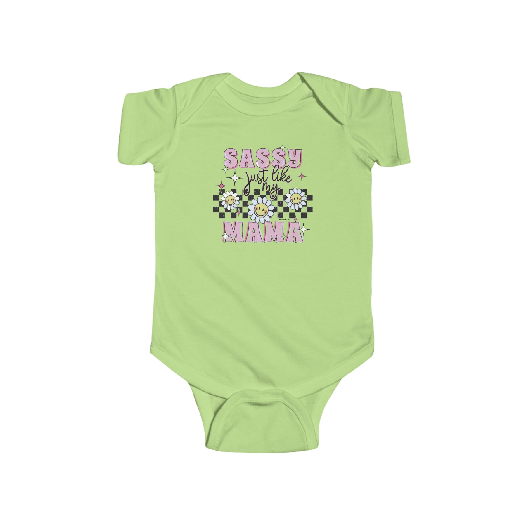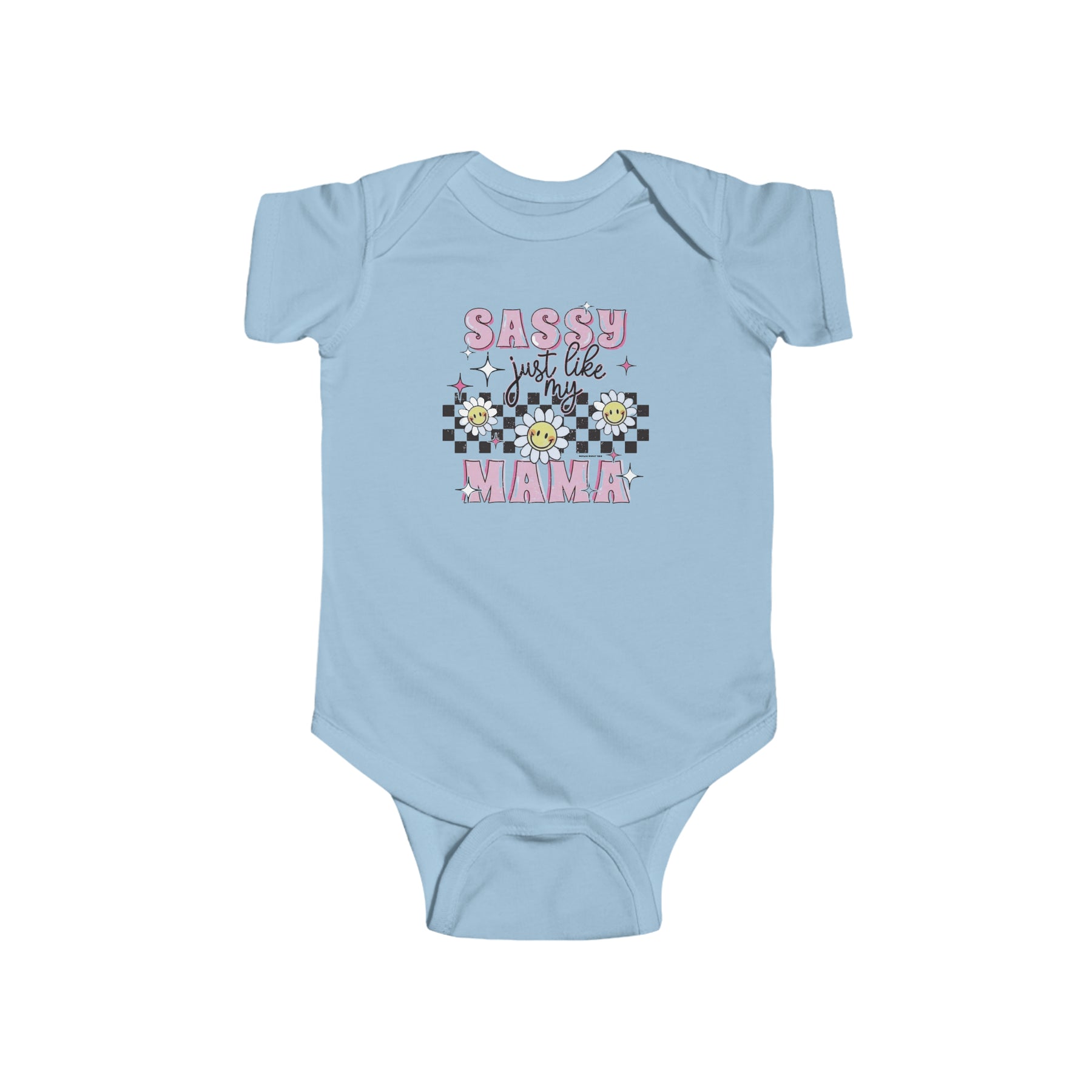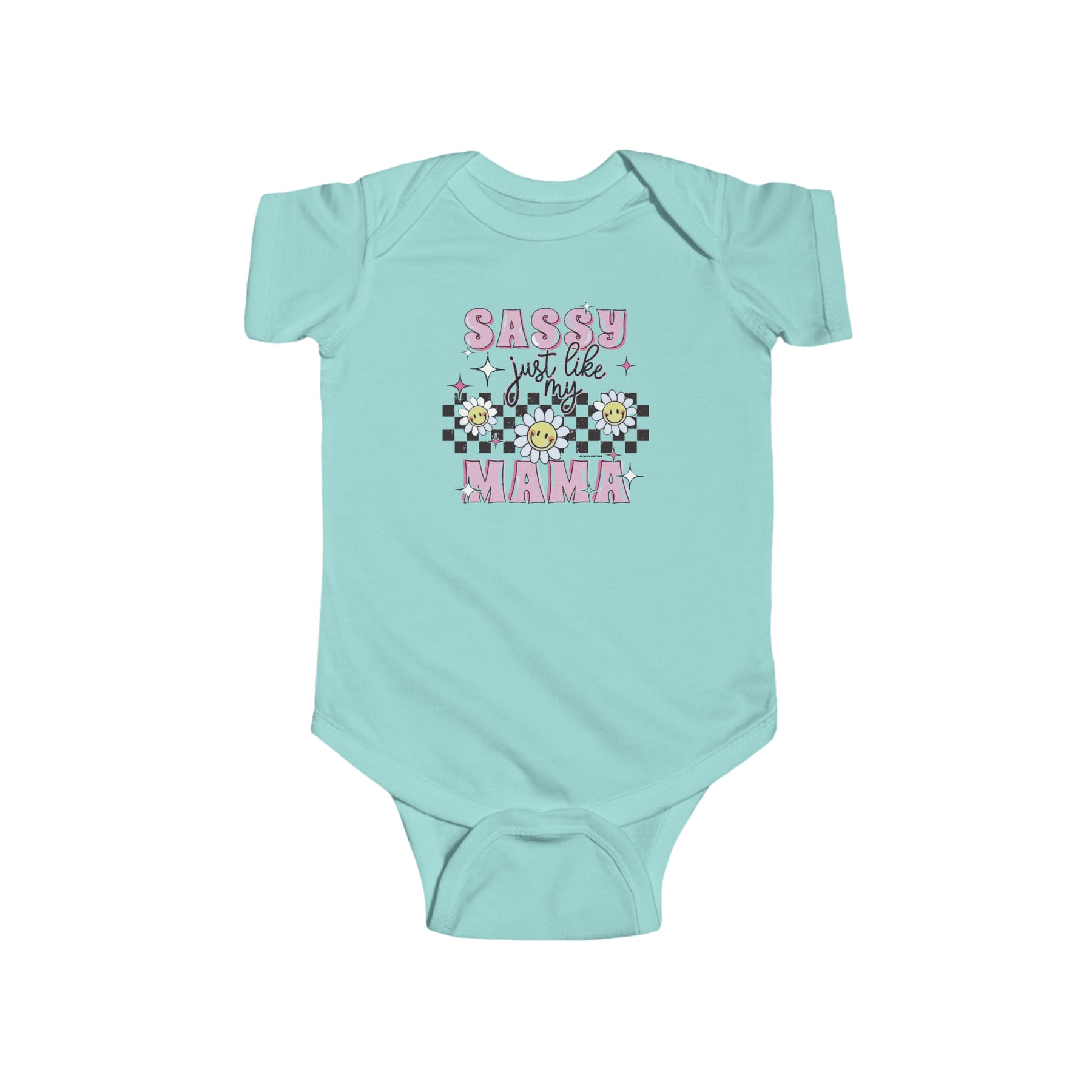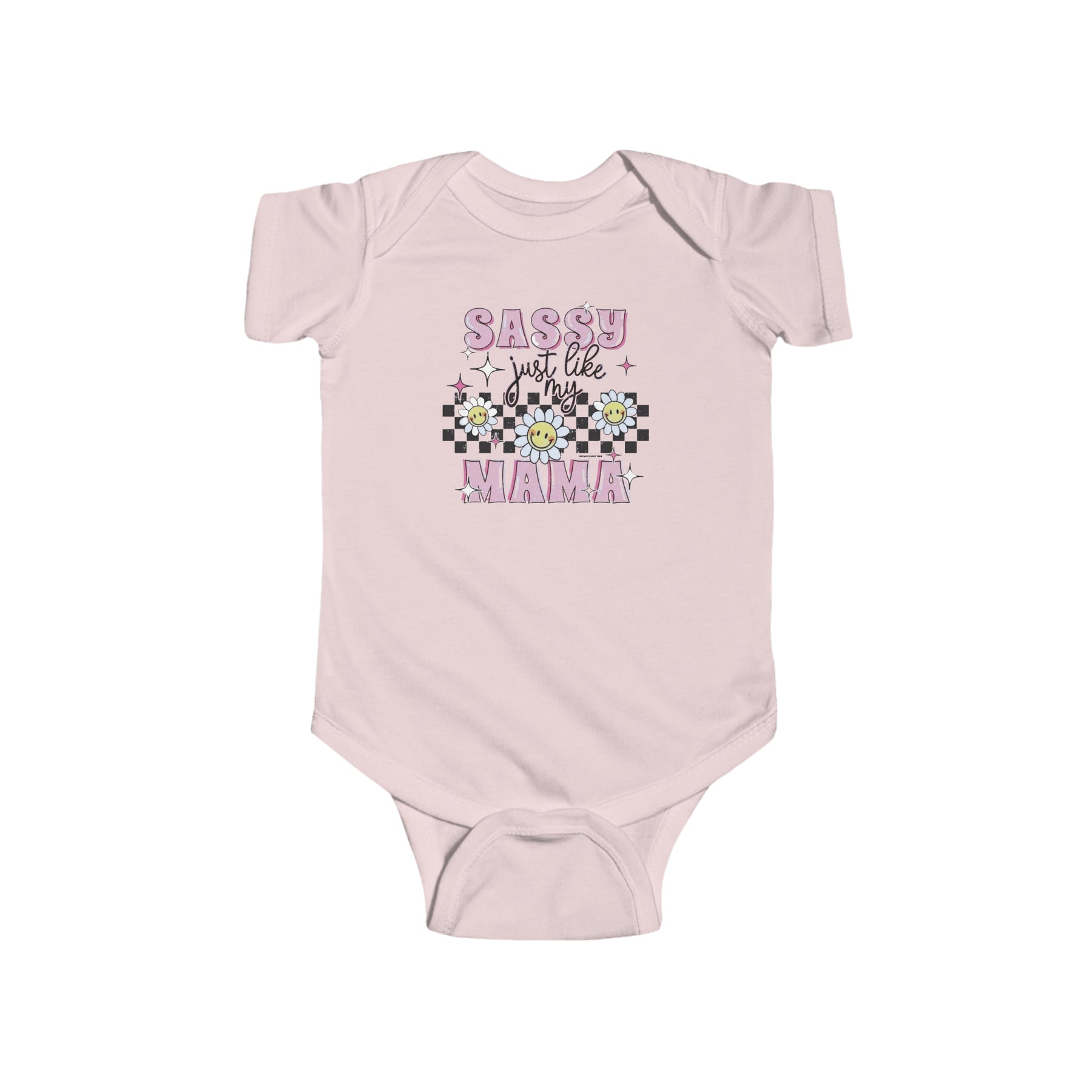A playful infant fine jersey bodysuit featuring a whimsical design of flowers, stars, and text. Crafted from 100% cotton for durability and comfort. Plastic snaps for easy changing. Title: Sassy like my mama Onesie.