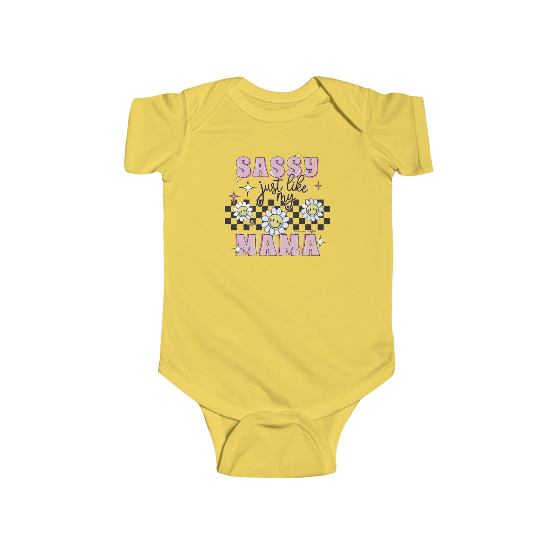 Infant fine jersey bodysuit with a yellow design, featuring flowers and a checkered pattern. Sassy like my mama Onesie for stylish babies. 100% cotton fabric, ribbed knitting, and plastic snaps for easy changing.