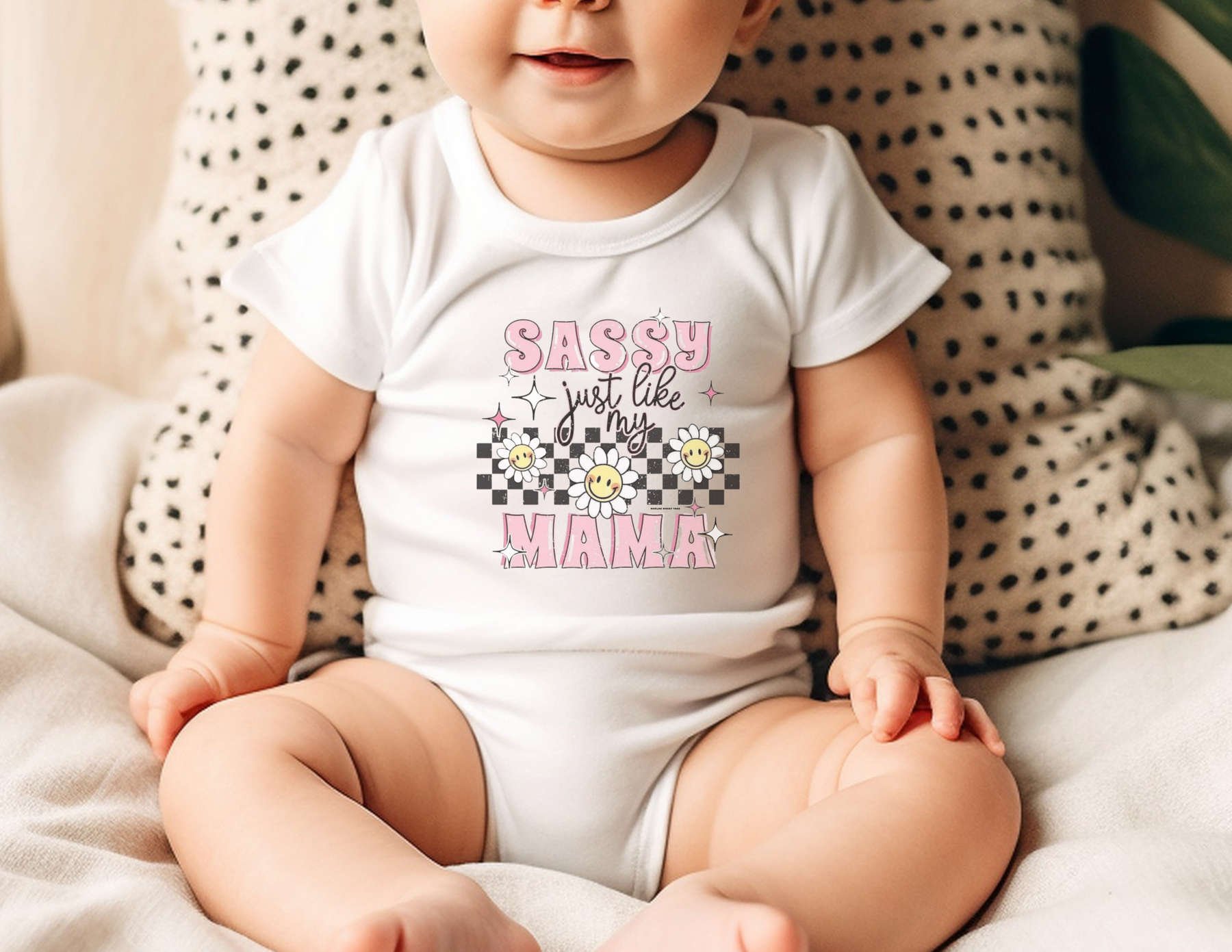 A baby wearing a Sassy like my mama onesie, sitting on a blanket. Infant fine jersey bodysuit, 100% cotton fabric, ribbed knitting for durability, plastic snaps for easy changing access. From Worlds Worst Tees.