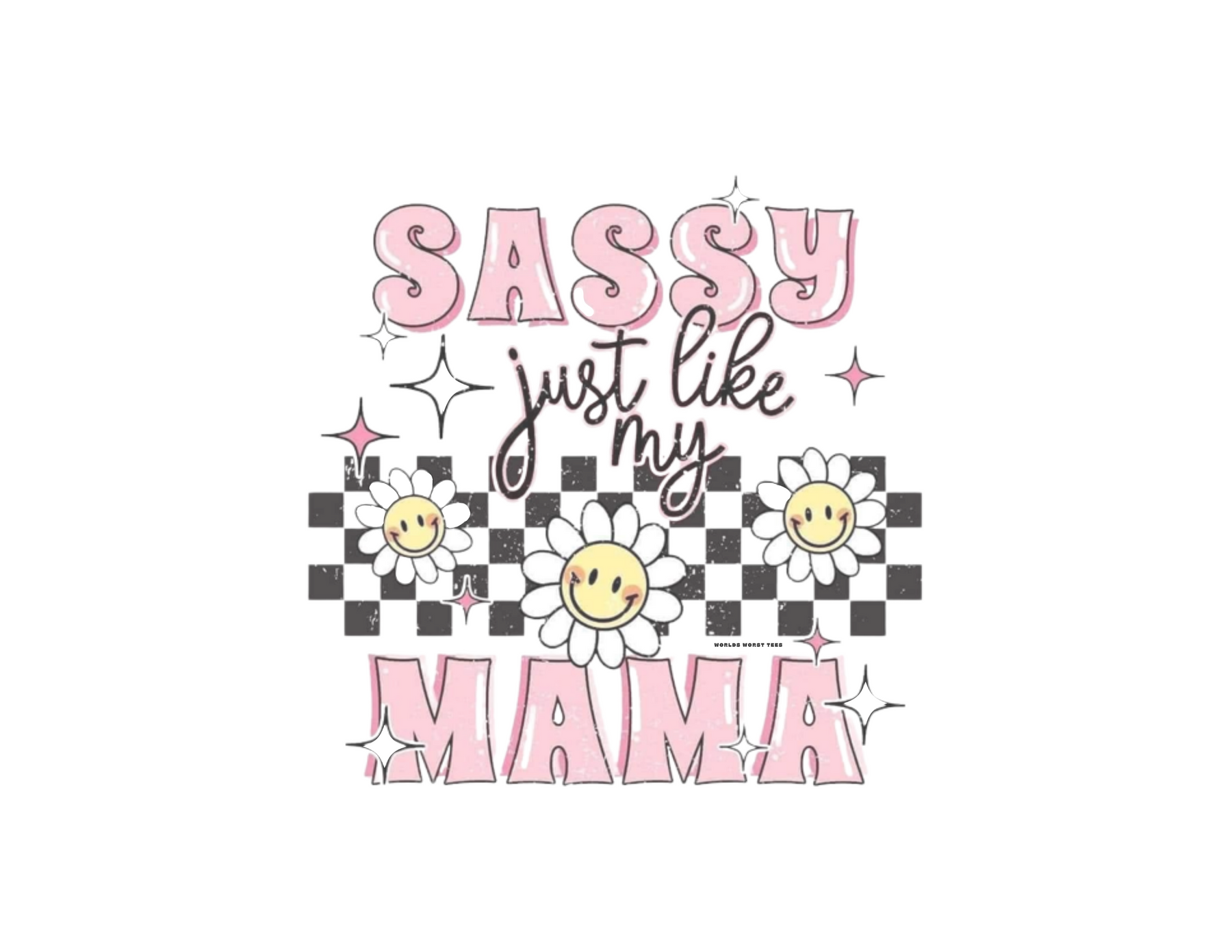 Infant fine jersey bodysuit featuring Sassy like my mama graphic. 100% cotton fabric, ribbed knitting for durability, plastic snaps for easy changing. From Worlds Worst Tees.
