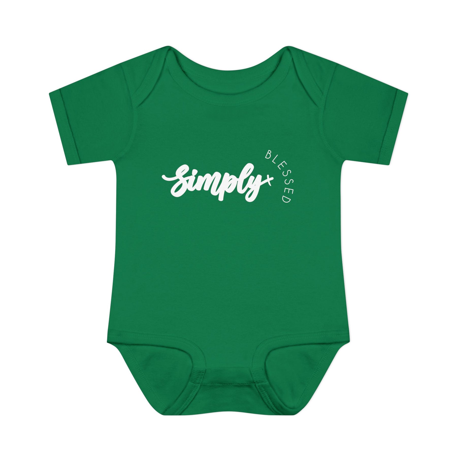 Simply Blessed Onesie: green baby bodysuit with white text, crafted from soft ring-spun cotton with lap shoulders for comfort and easy changes.