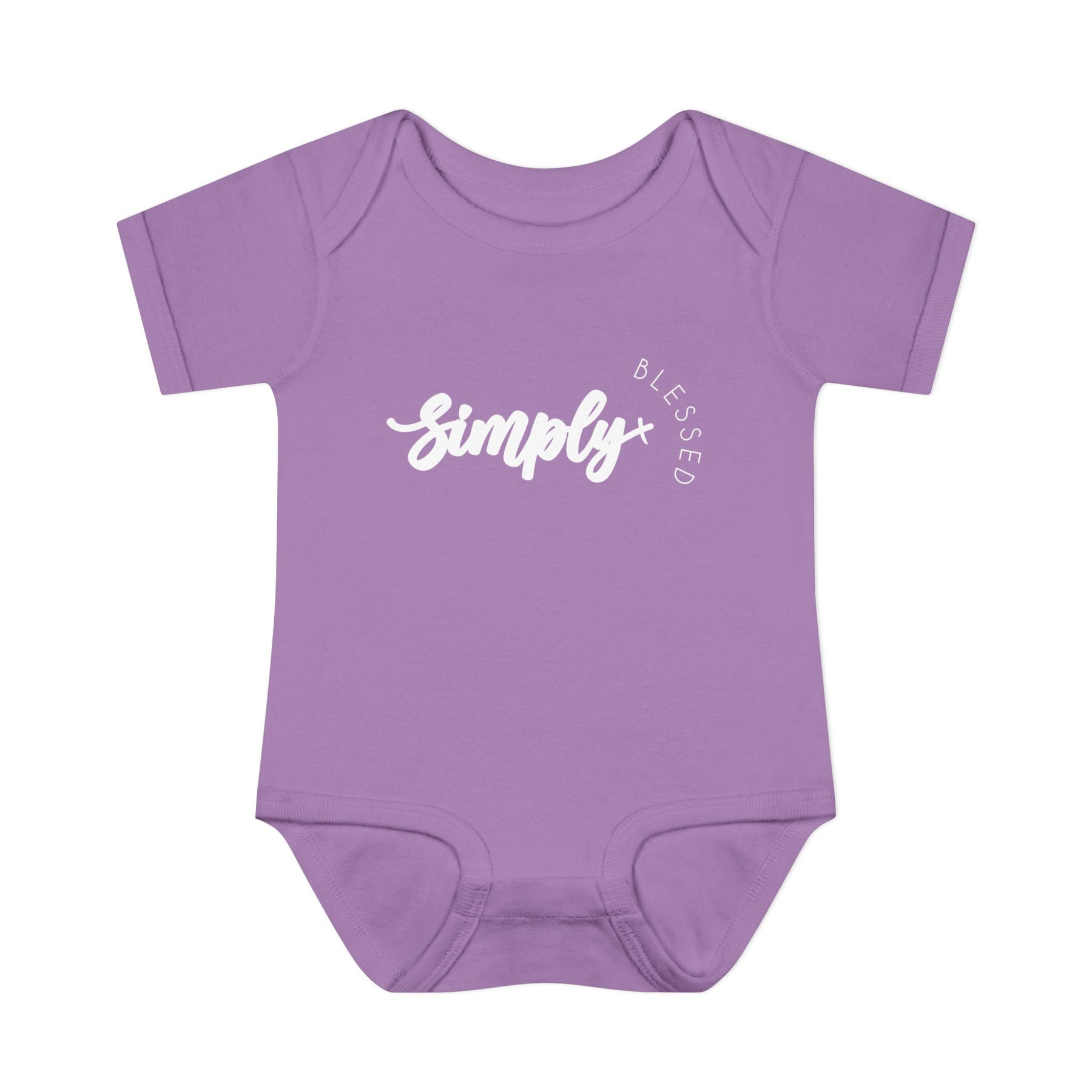 Simply Blessed Onesie: A purple baby bodysuit with white text, featuring soft ring-spun cotton and lap shoulders for comfort and easy dressing.