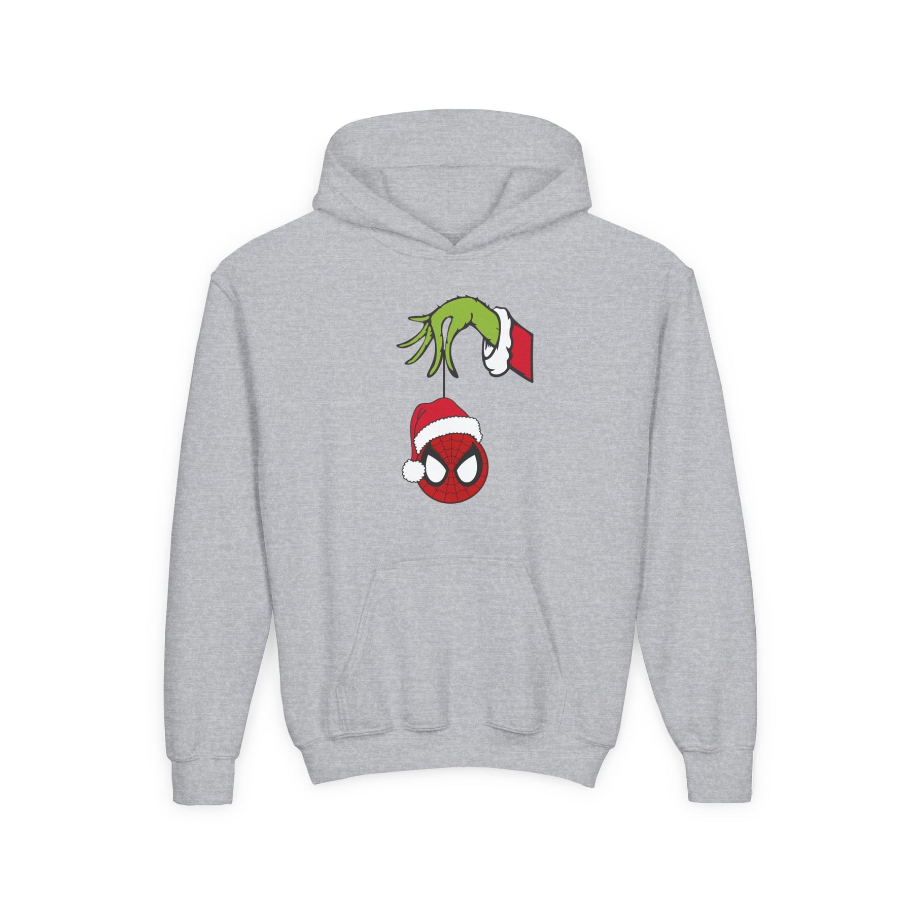 Spider Ball Christmas Youth Hoodie featuring the Grinch's hand holding Spider-Man ornament, Santa hat. Ultra-soft fleece, kangaroo pocket, regular fit, perfect for festive fun.