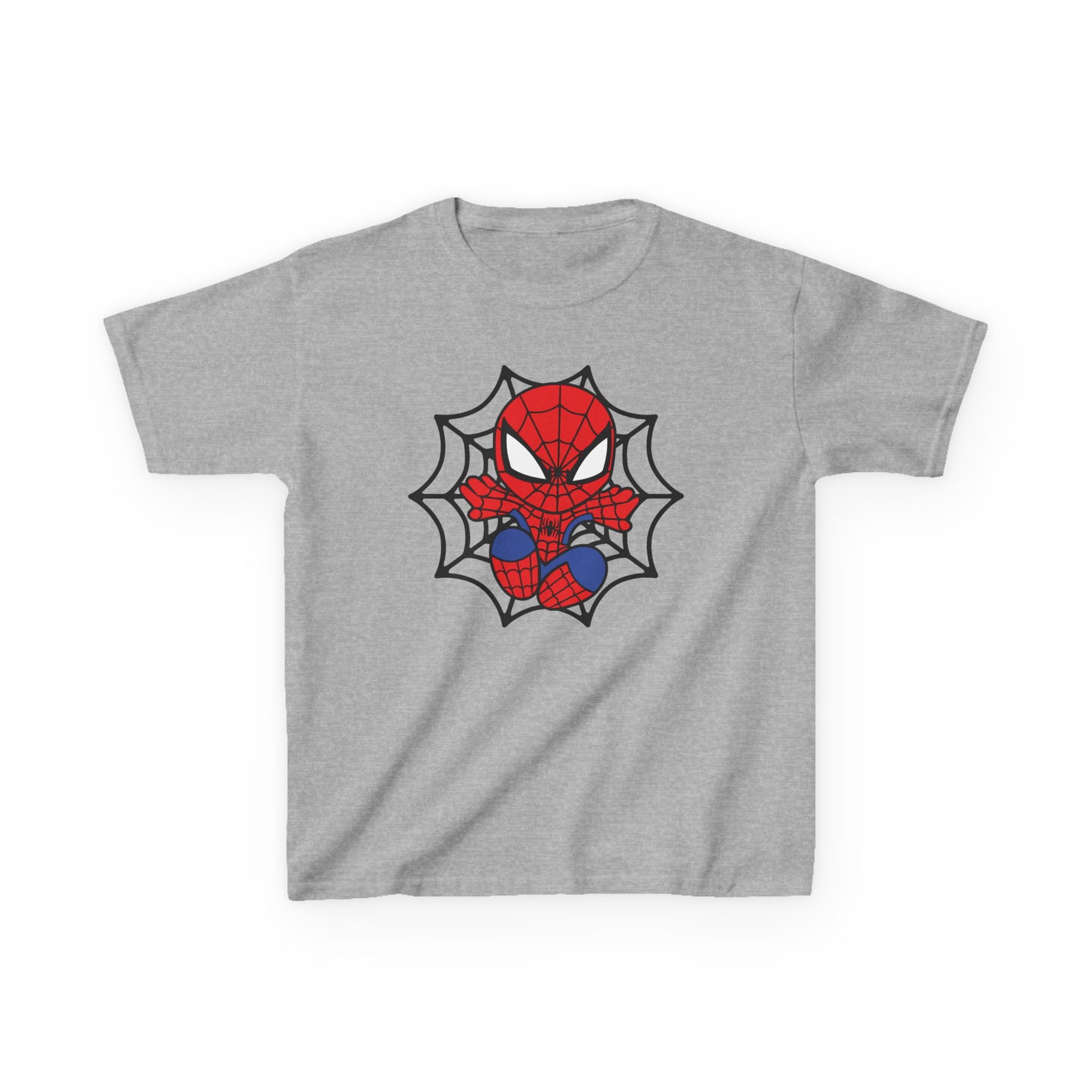 Spider Kid Kids Tee features a chibi Spider-Man in a cartoon style, crouching inside a spider-web on a light-gray, short-sleeved shirt, perfect for everyday wear.