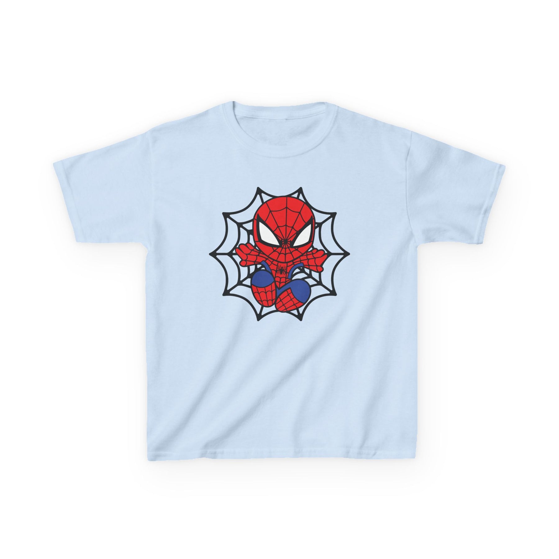 Spider Kid Kids Tee features a chibi Spider-Man on light-blue cotton, ideal for daily wear, offering durability with a soft touch.
