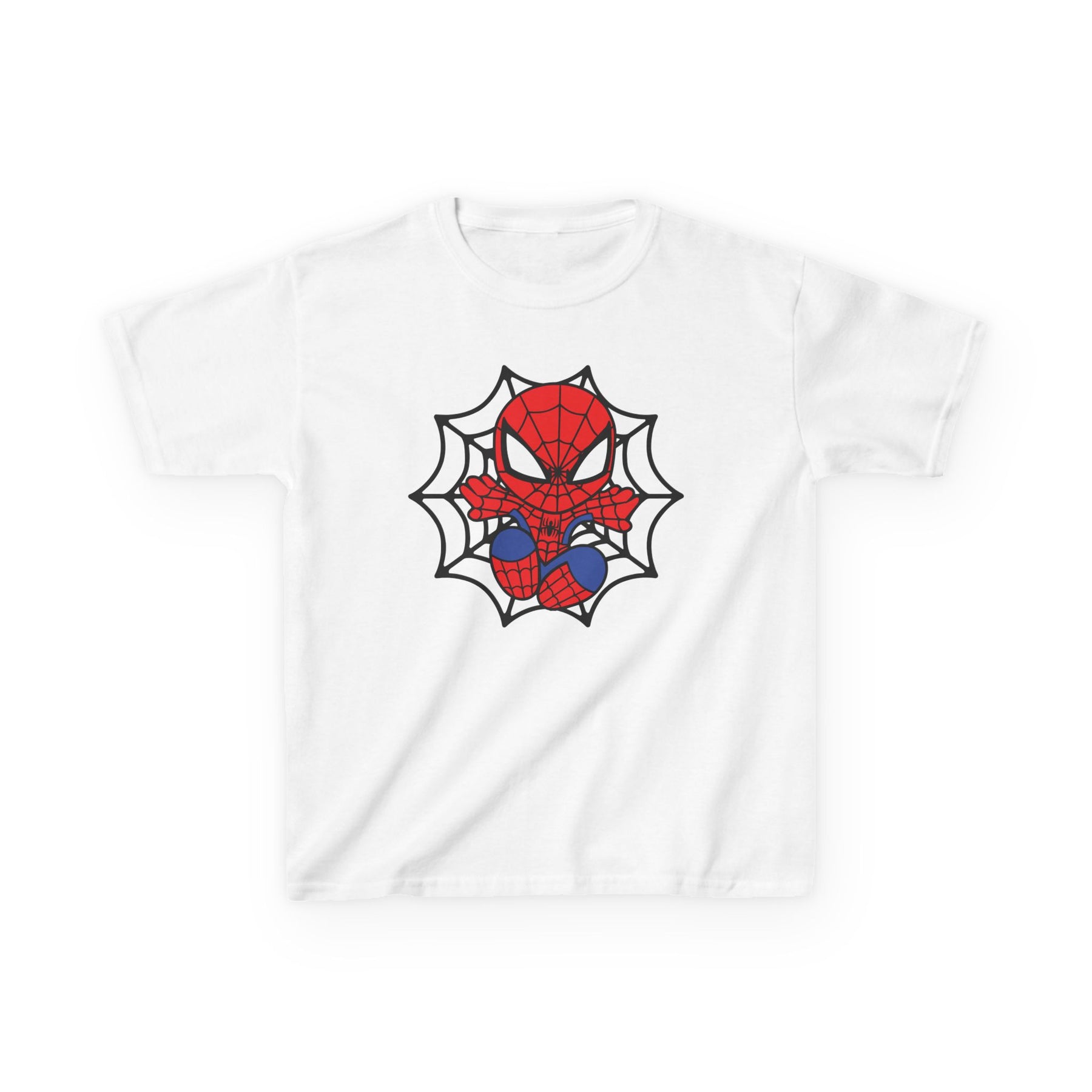 Spider Kid Kids Tee featuring a chibi Spider-Man in red-and-blue costume on a plain white T-shirt, ideal for everyday wear.