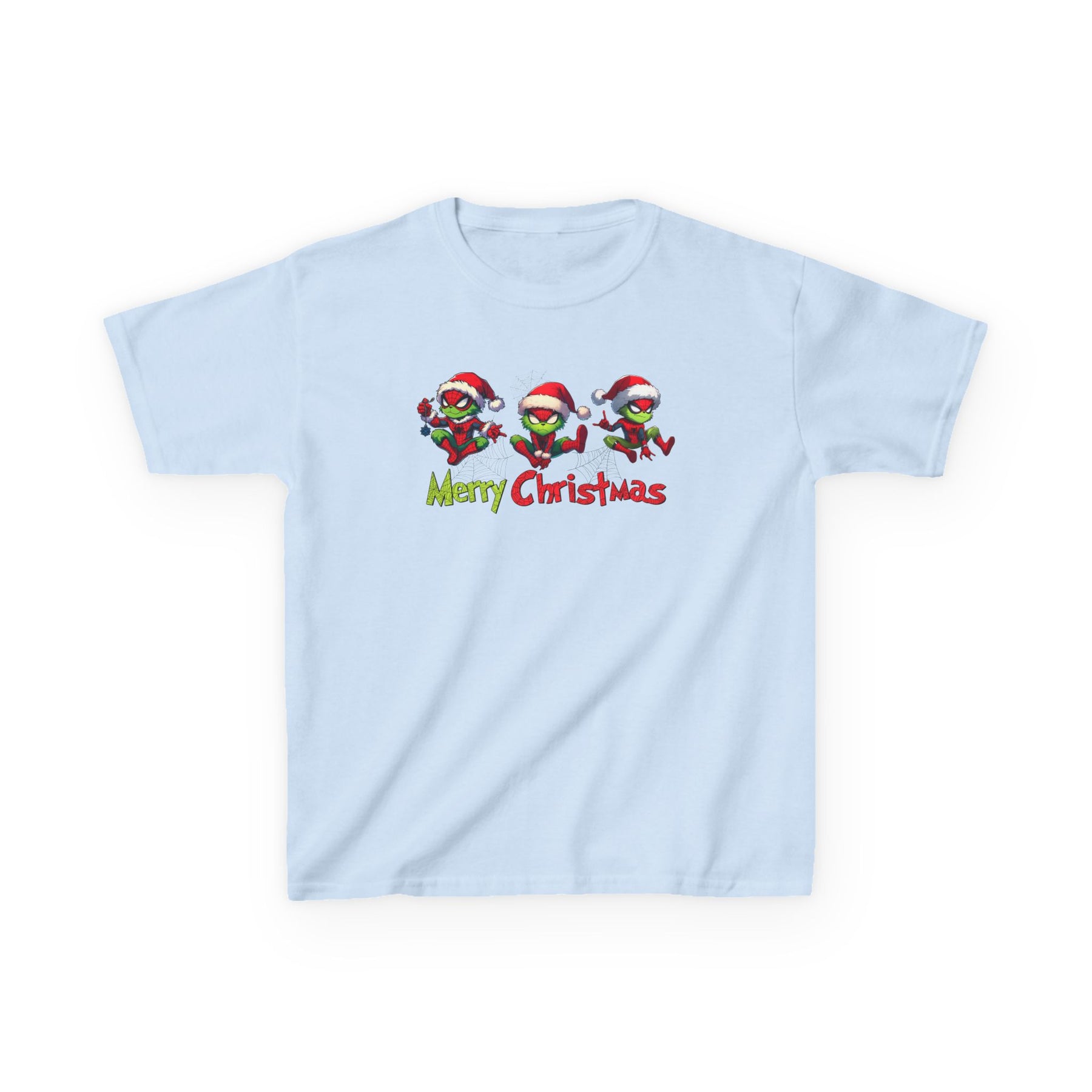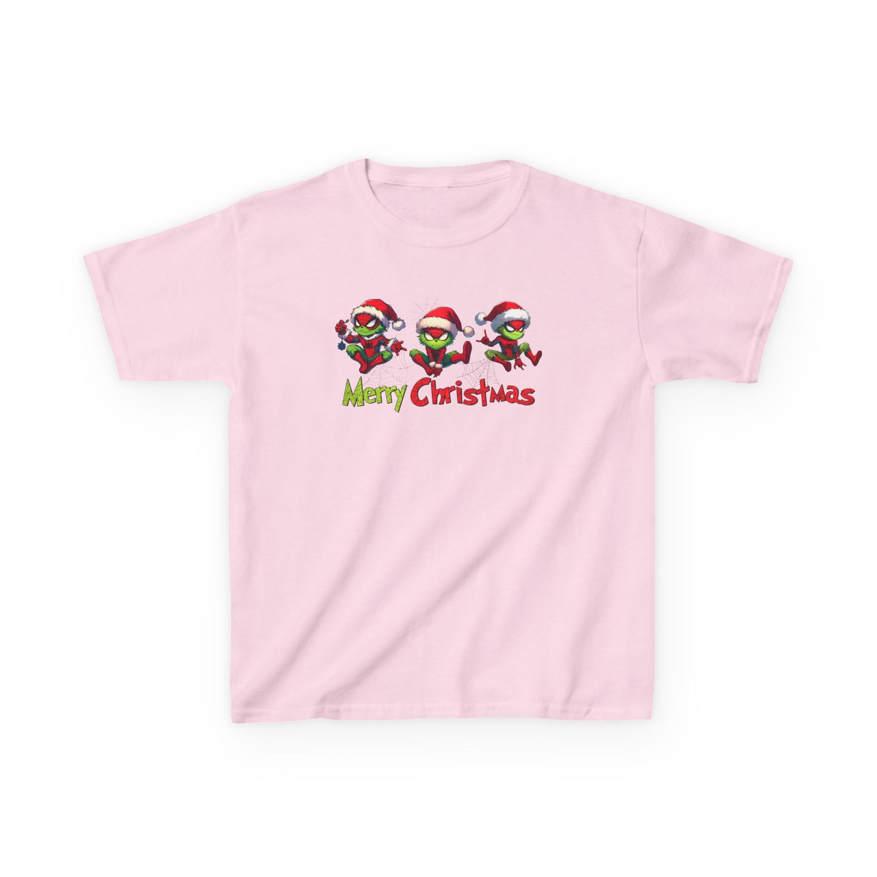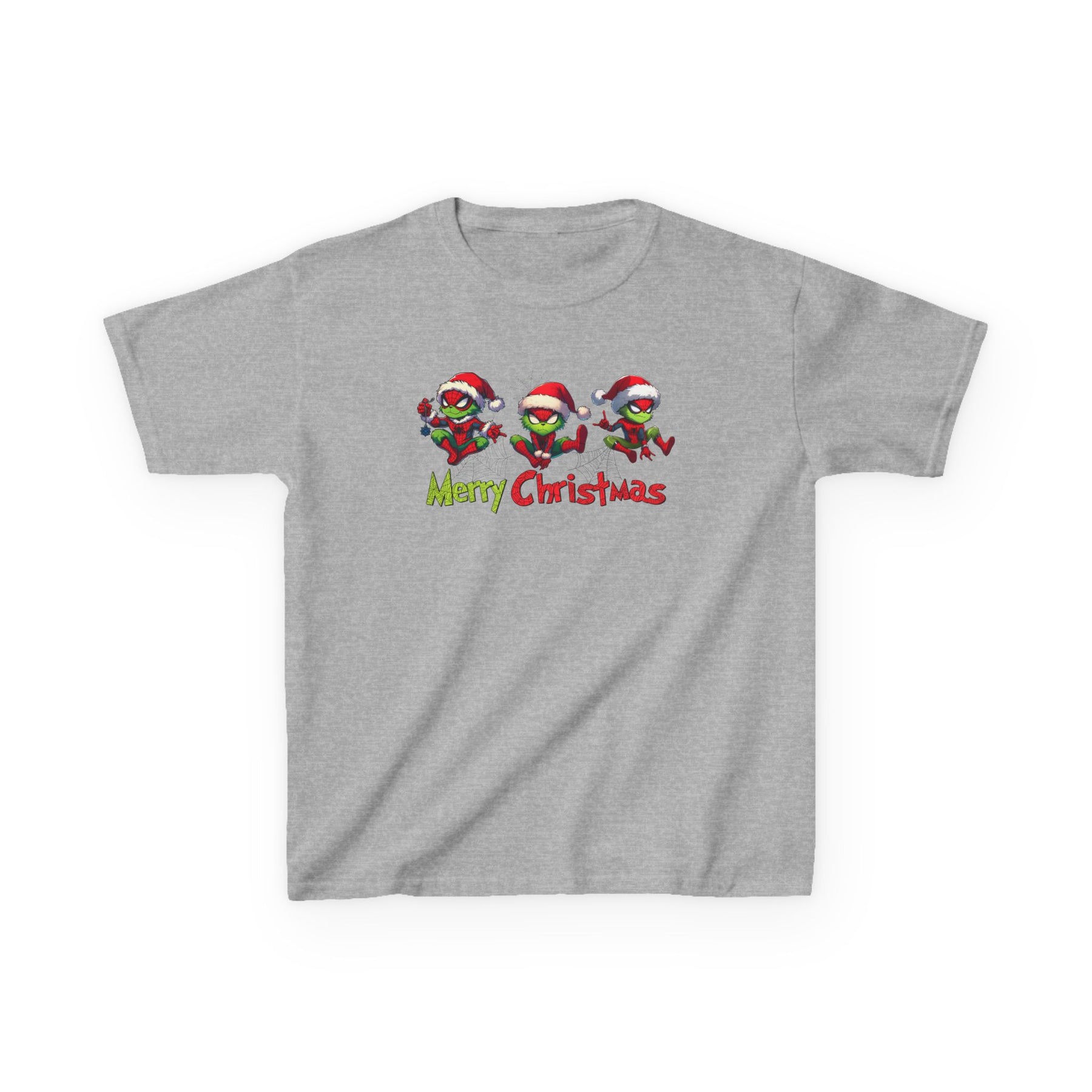 Spider Kids Tee features three green cartoon characters in Santa hats with Merry Christmas text. Perfect for everyday wear, offering durability and comfort.