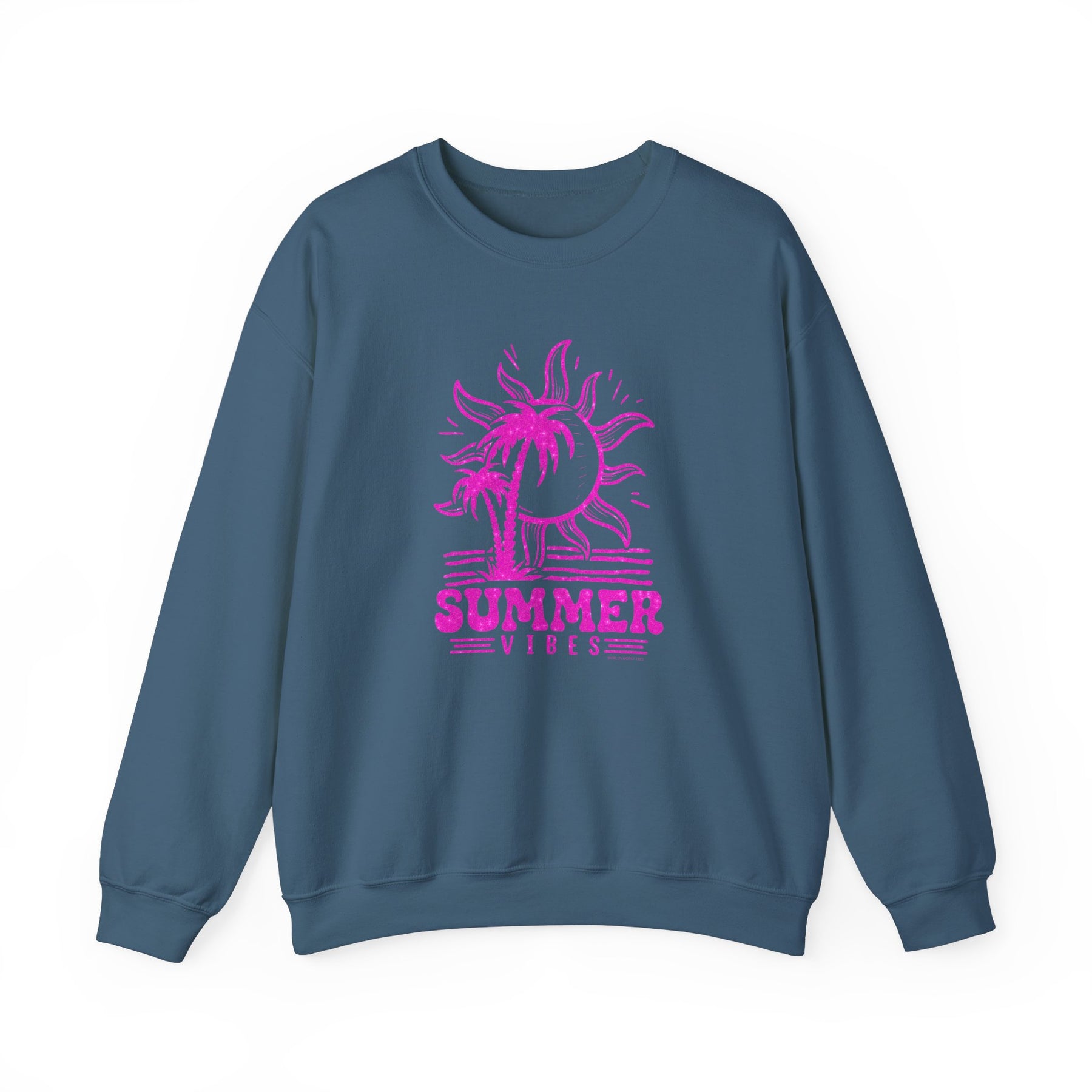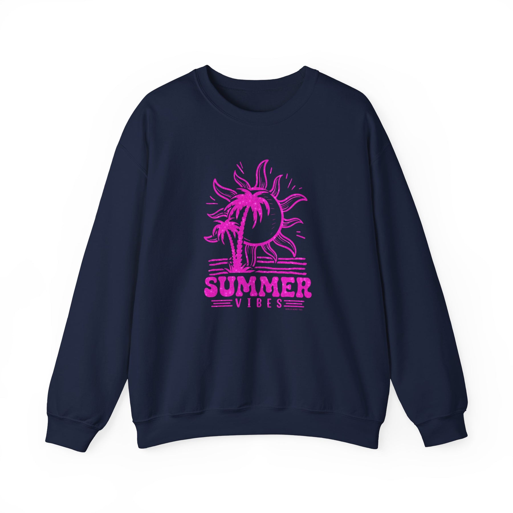 A Summer Vibes Crew unisex sweatshirt featuring a blue design with a pink sun and palm trees. Made of 50% cotton and 50% polyester, with ribbed knit collar and no itchy side seams. Medium-heavy fabric for comfort.