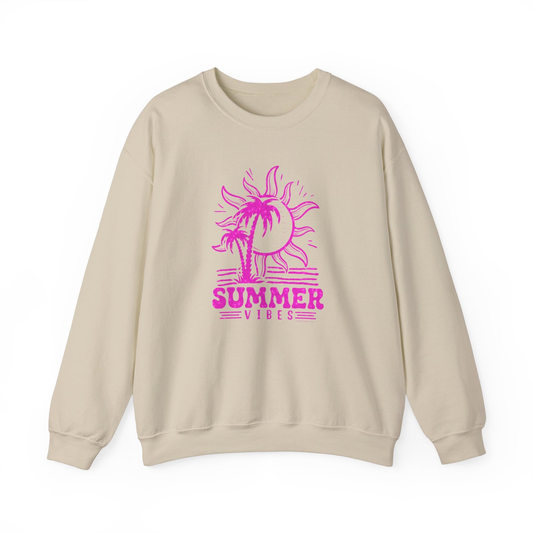 A beige crewneck sweatshirt featuring a pink sun and palm tree design, embodying summer vibes. Unisex heavy blend fabric for comfort, ribbed knit collar, and no itchy side seams. Ideal for casual wear.
