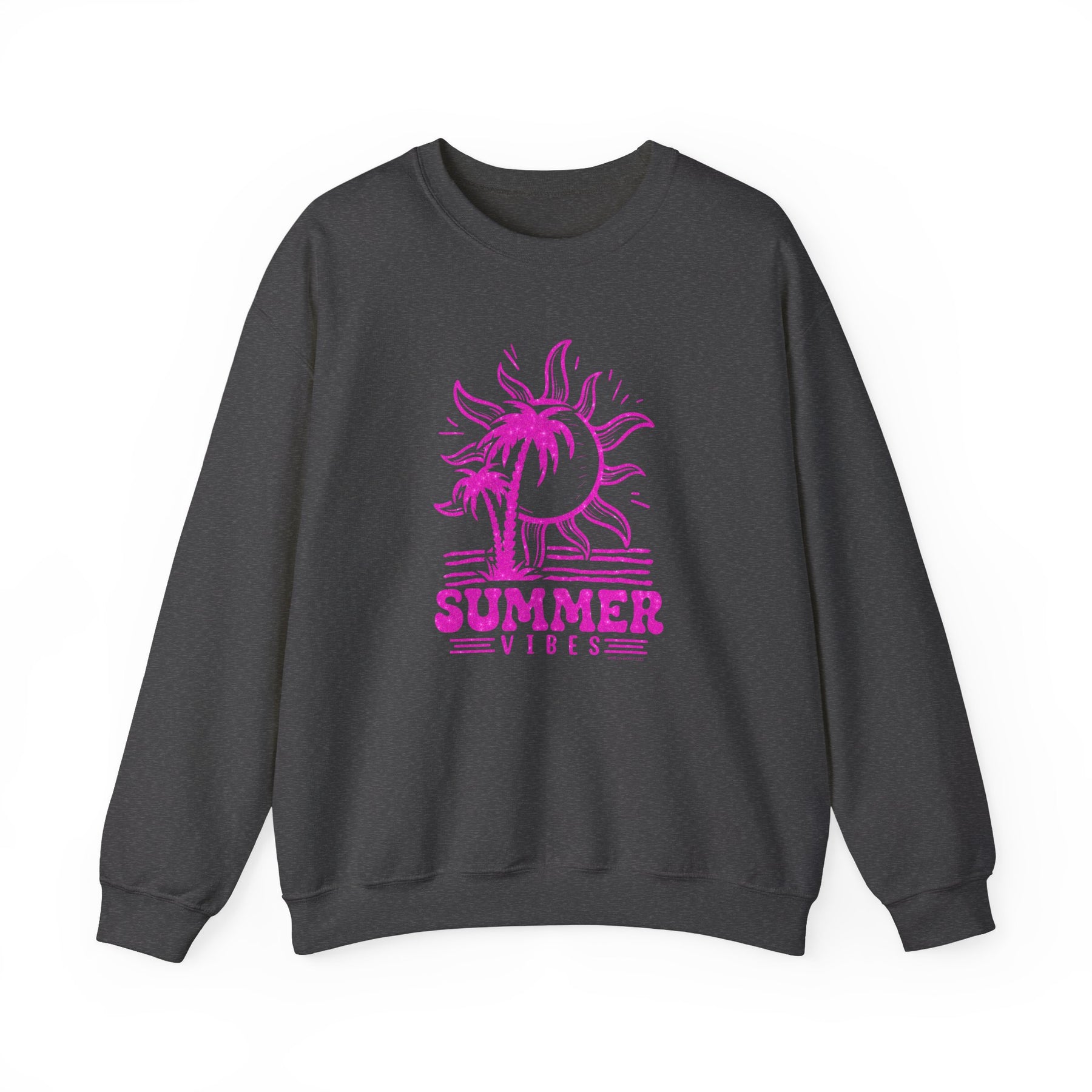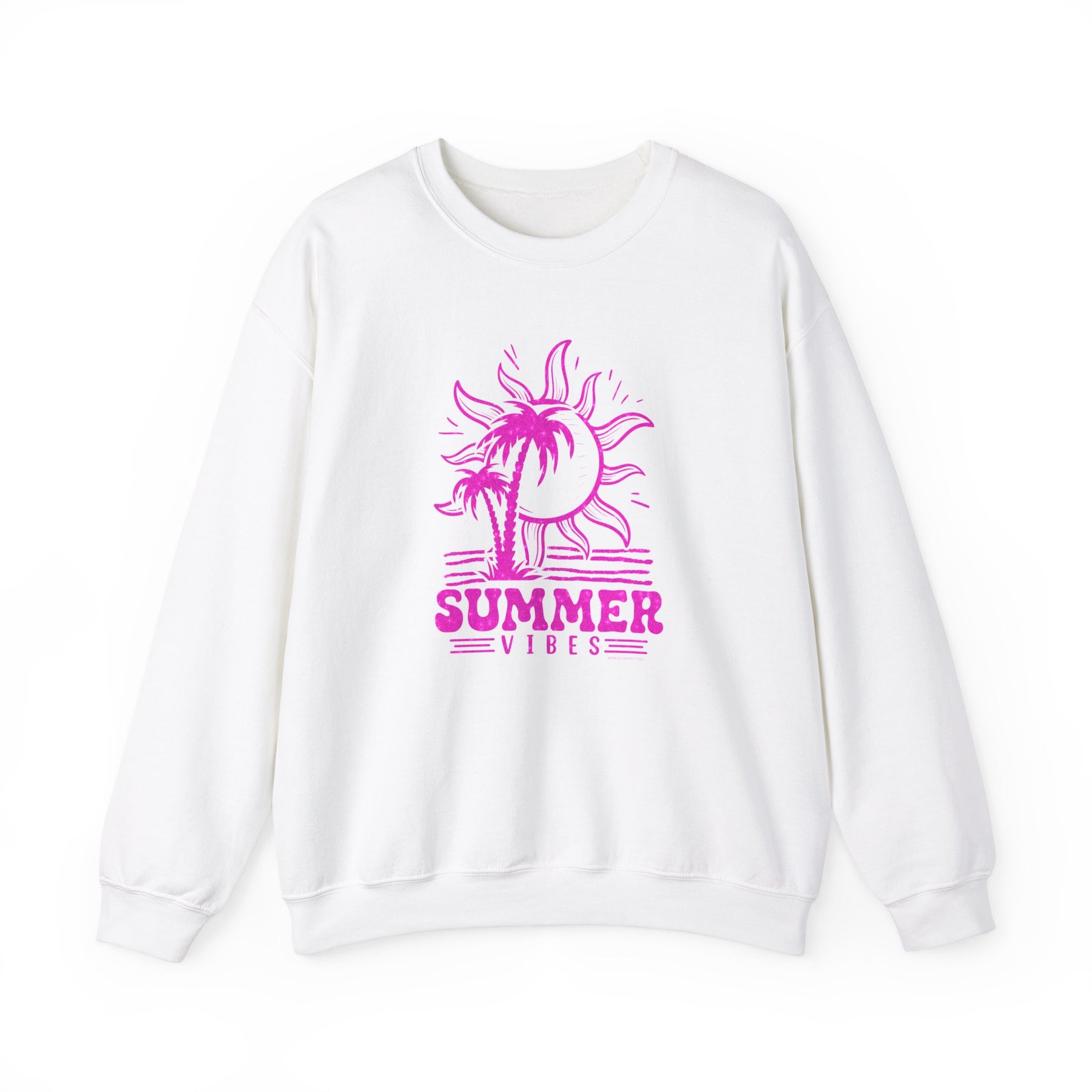 A white crewneck sweatshirt featuring a pink sun and palm tree graphics, embodying summer vibes. Unisex heavy blend fabric for comfort, ribbed knit collar, and no itchy seams. Perfect for casual wear.