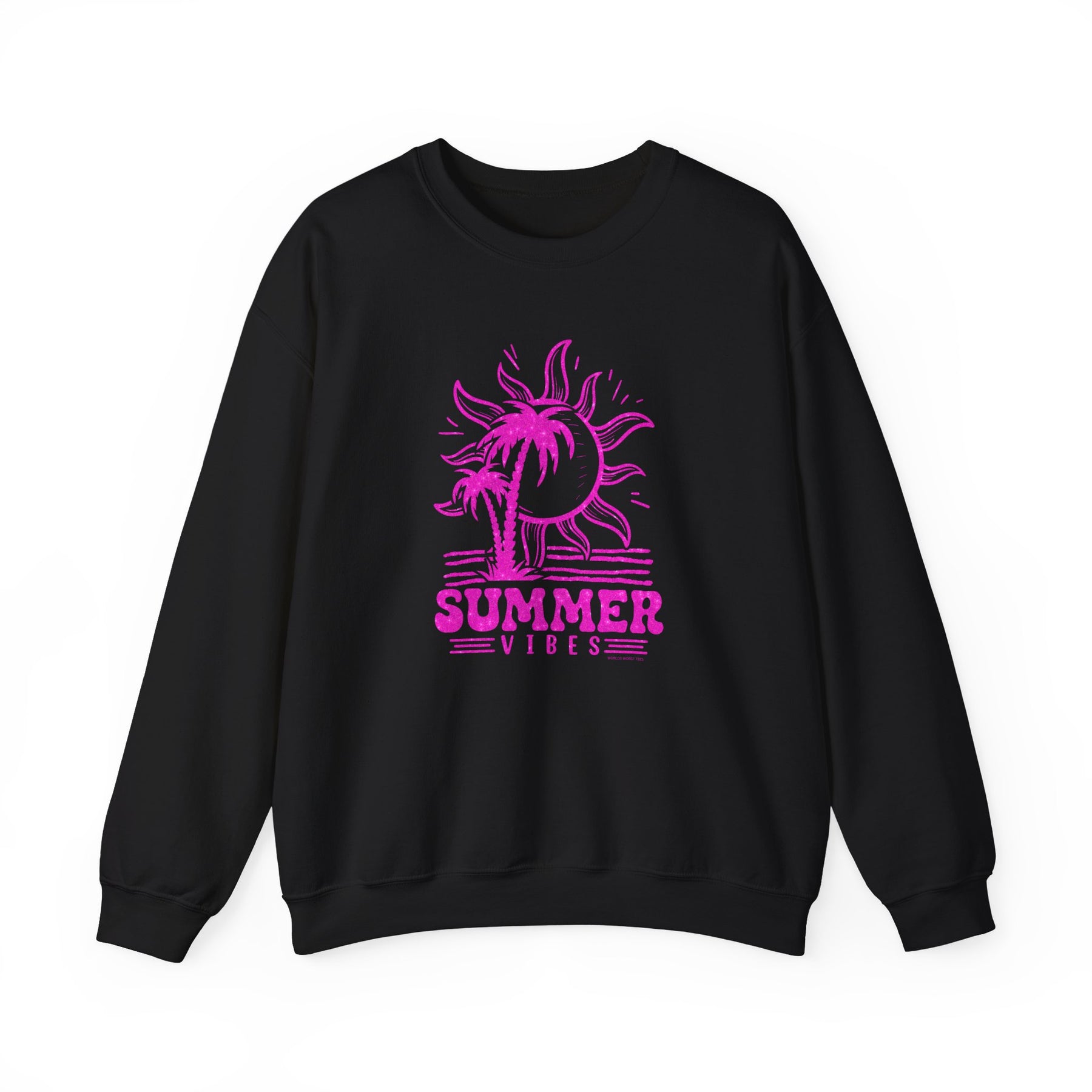 A black crewneck sweatshirt featuring pink summer-themed graphics like sun, palm trees, and a logo. Unisex heavy blend for comfort, ribbed knit collar, and no itchy side seams. Ideal for all occasions.