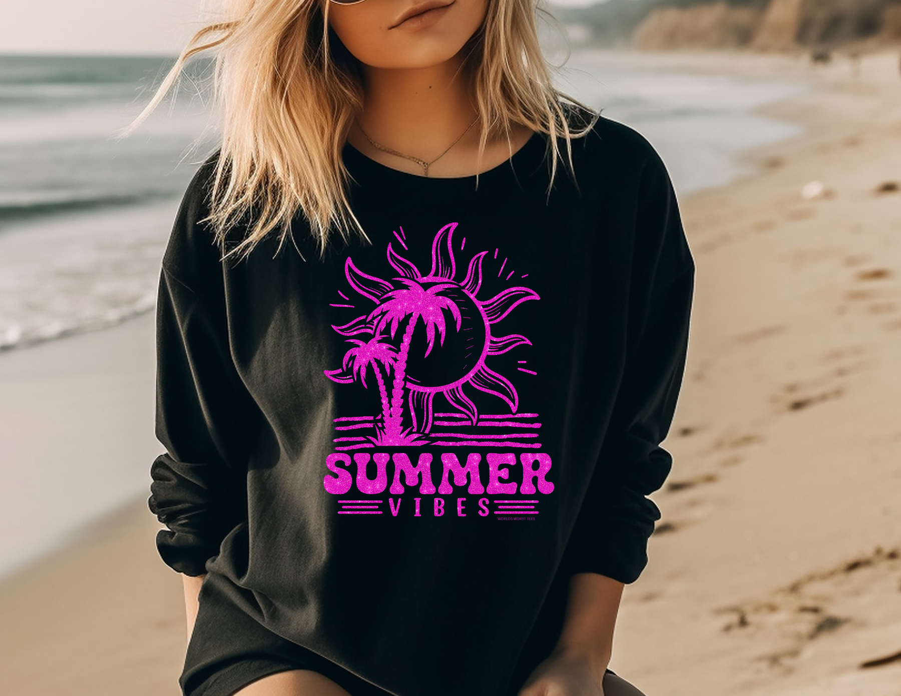 Unisex Summer Vibes Crew sweatshirt featuring a pink sun, palm trees, and beach design. Comfortable blend of polyester and cotton, ribbed knit collar, no itchy side seams. Sizes S to 5XL available.