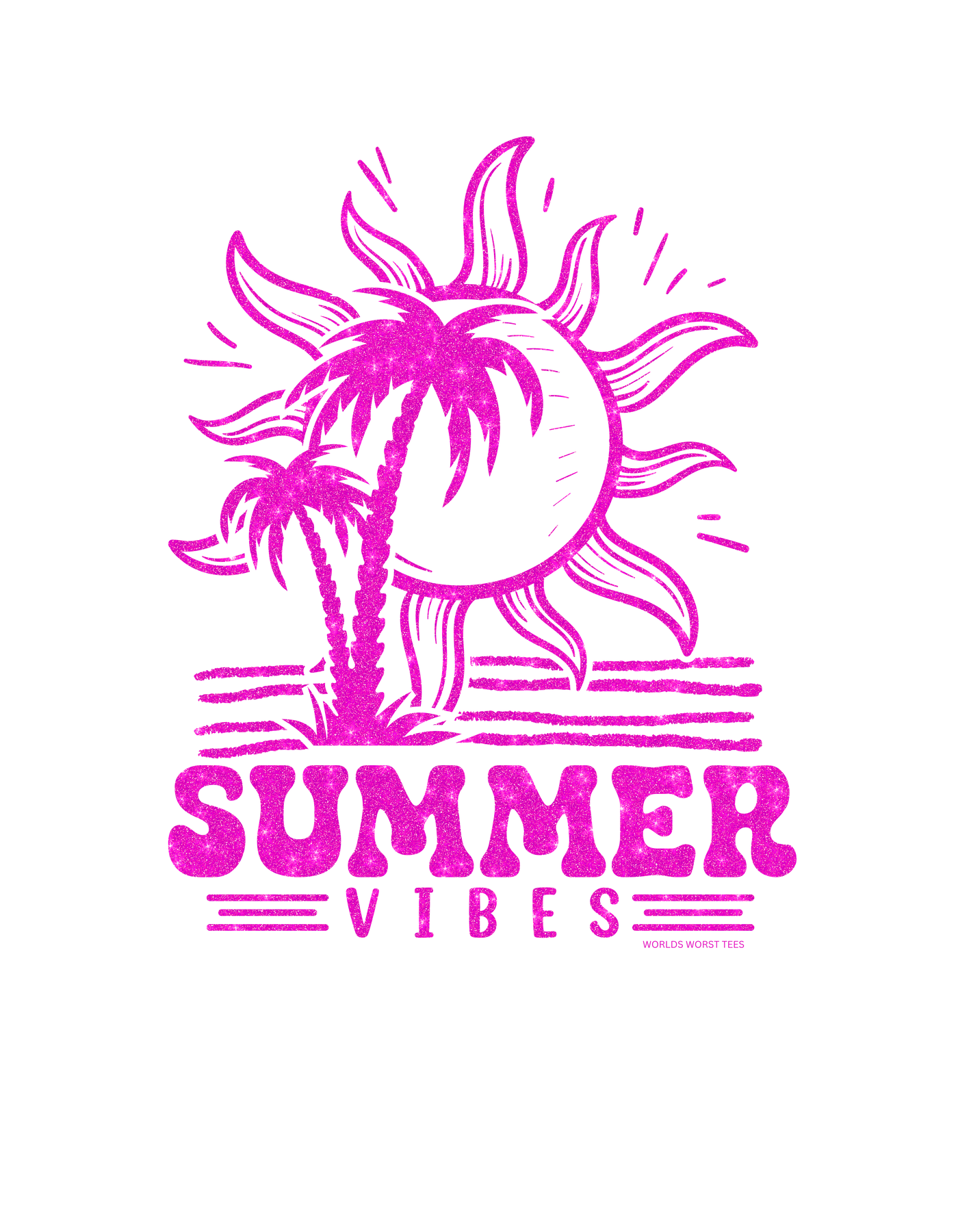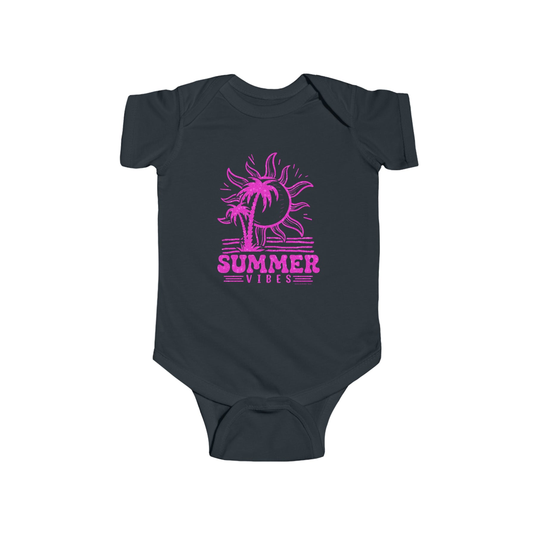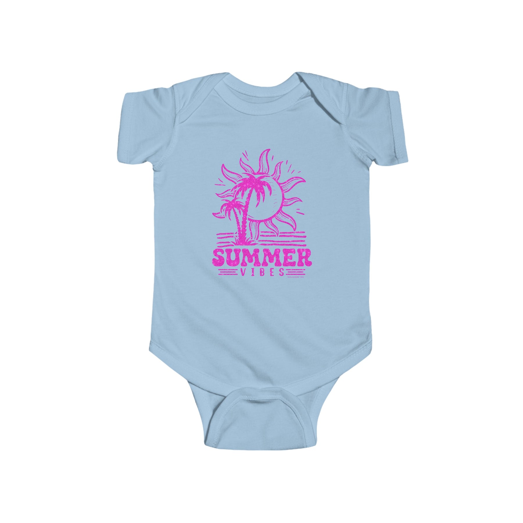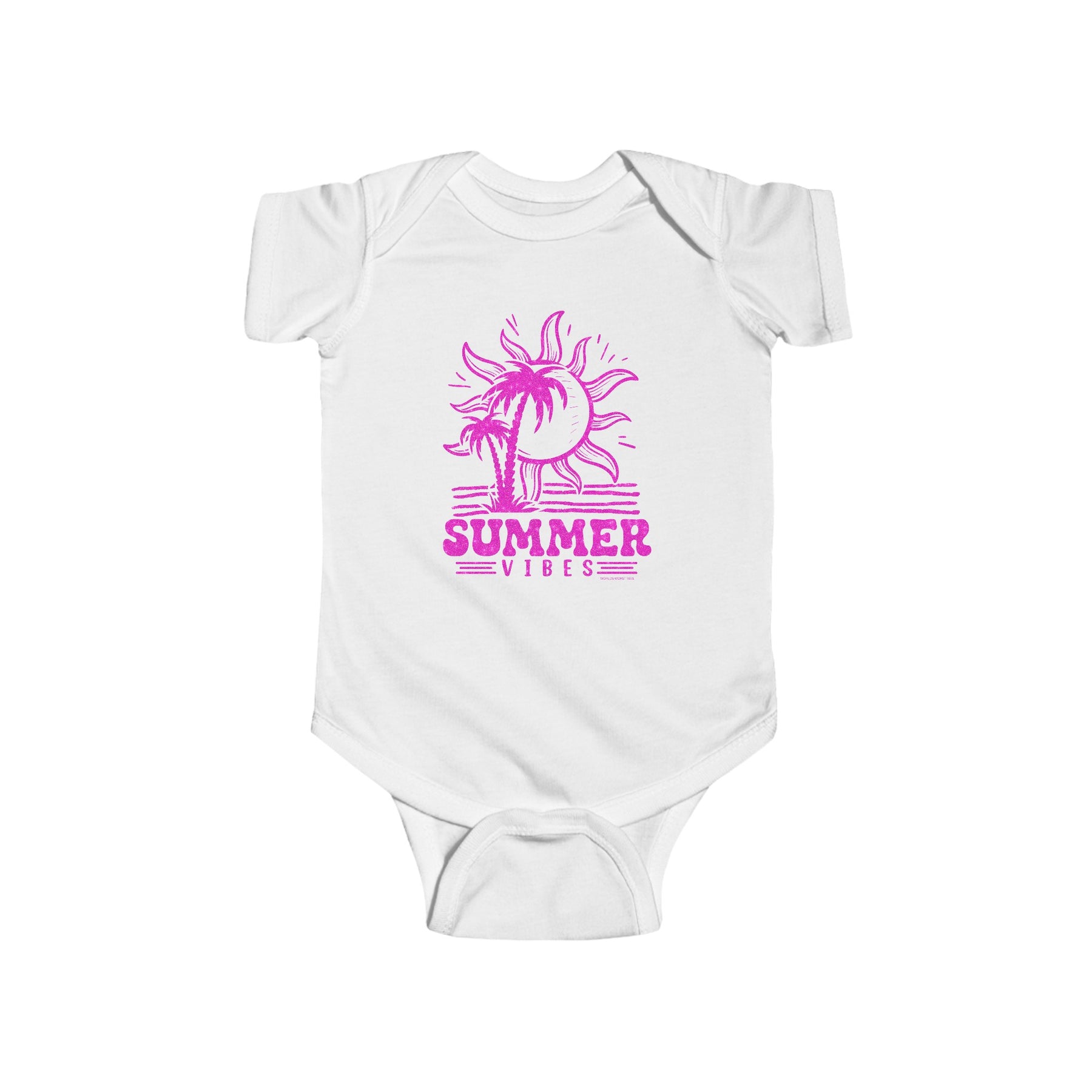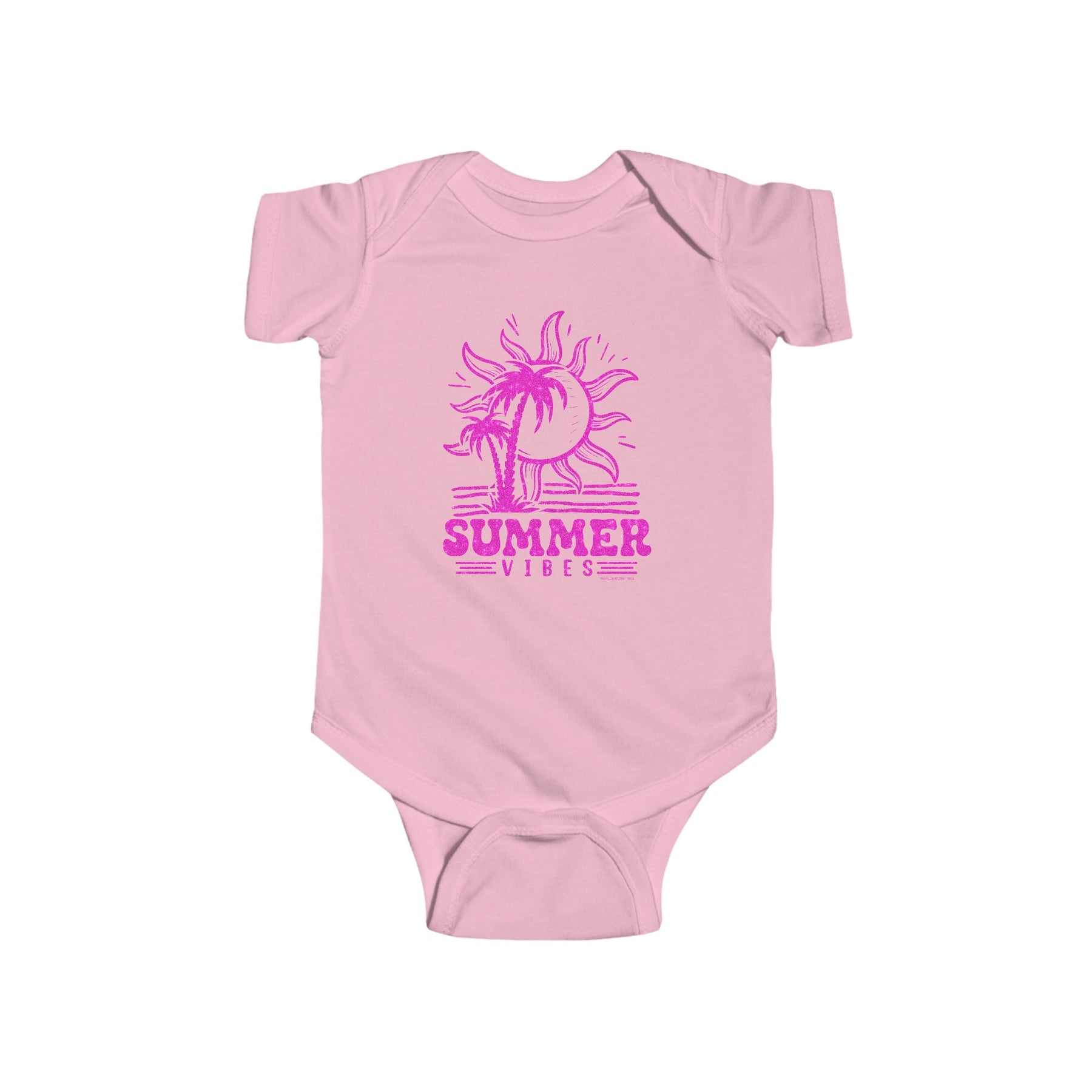 A pink glittery logo featuring palm trees and a sun, embodying Summer Vibes Onesie for infants by Worlds Worst Tees. 100% cotton fabric, ribbed knit bindings, and plastic snaps for easy changing access.
