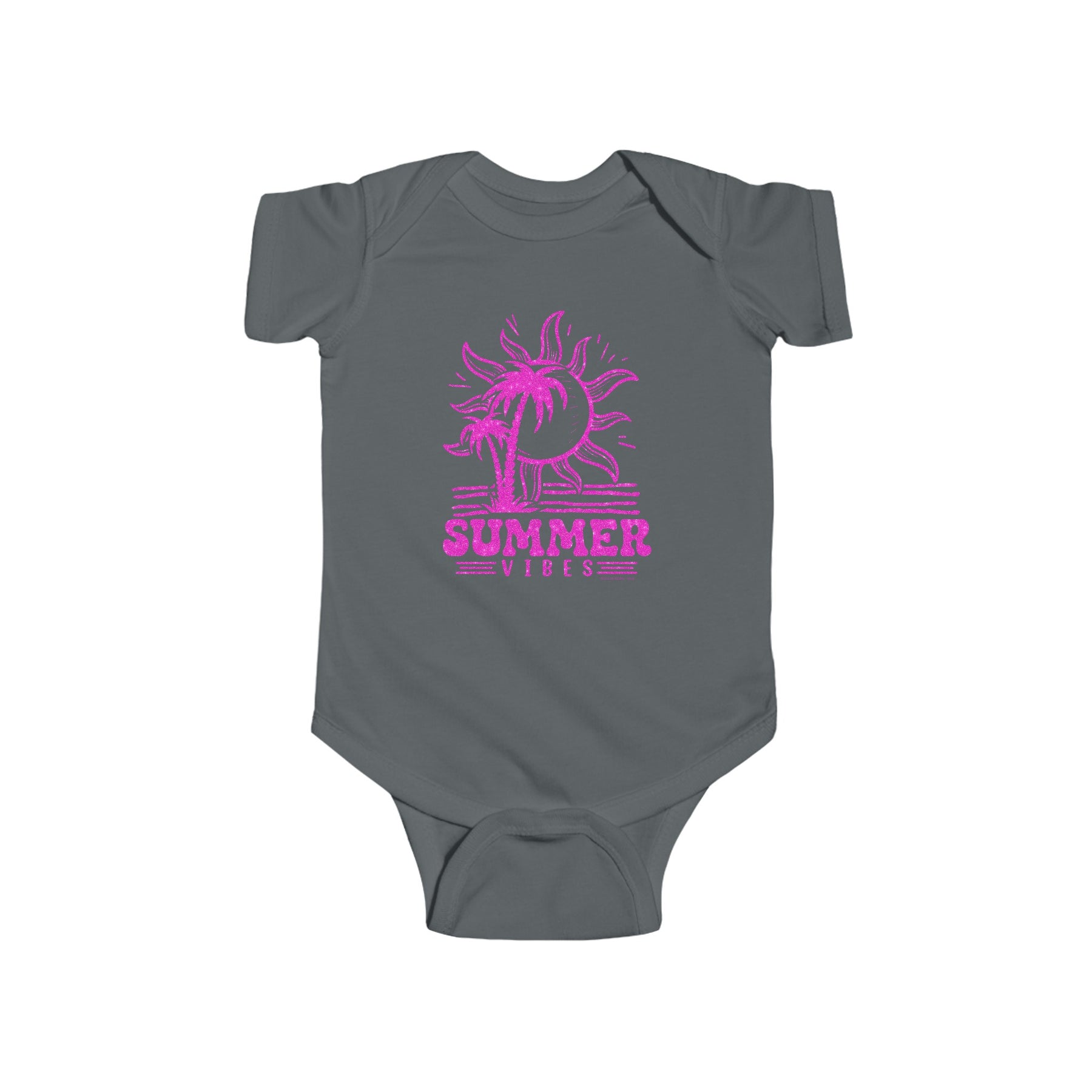 A grey baby bodysuit featuring a pink sun and palm trees, embodying Summer Vibes Onesie by Worlds Worst Tees. Made of 100% cotton, with ribbed bindings and plastic snaps for easy changing access. Sizes range from 0-3M to 24M.