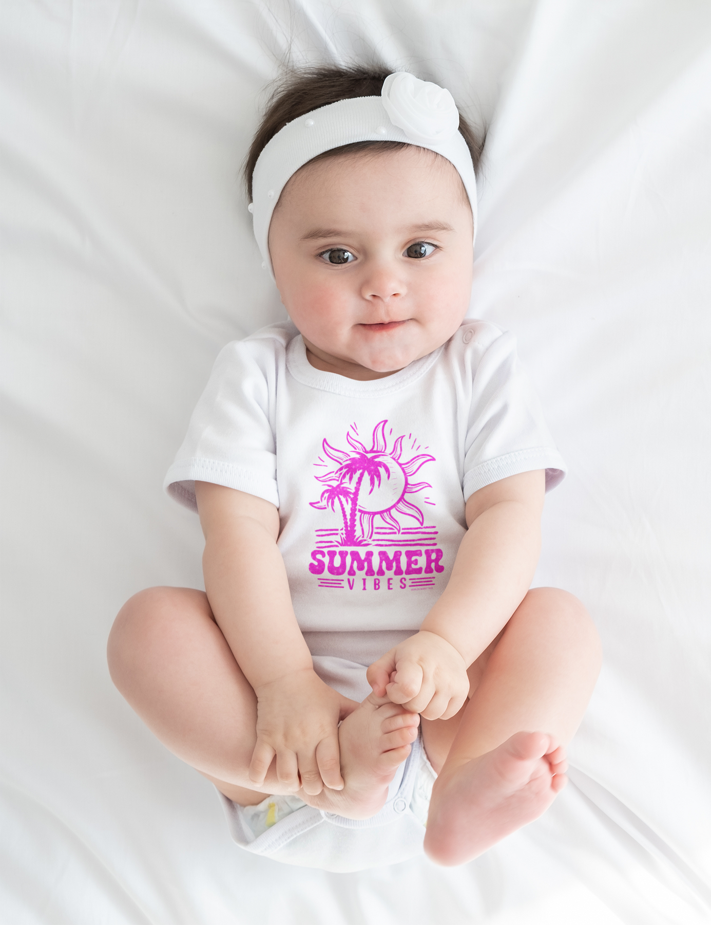 A baby lies on a white sheet wearing a Summer Vibes Onesie. This infant fine jersey bodysuit is 100% cotton, featuring ribbed bindings and plastic snaps for easy changes. Perfect for little ones enjoying the sun and palm trees.