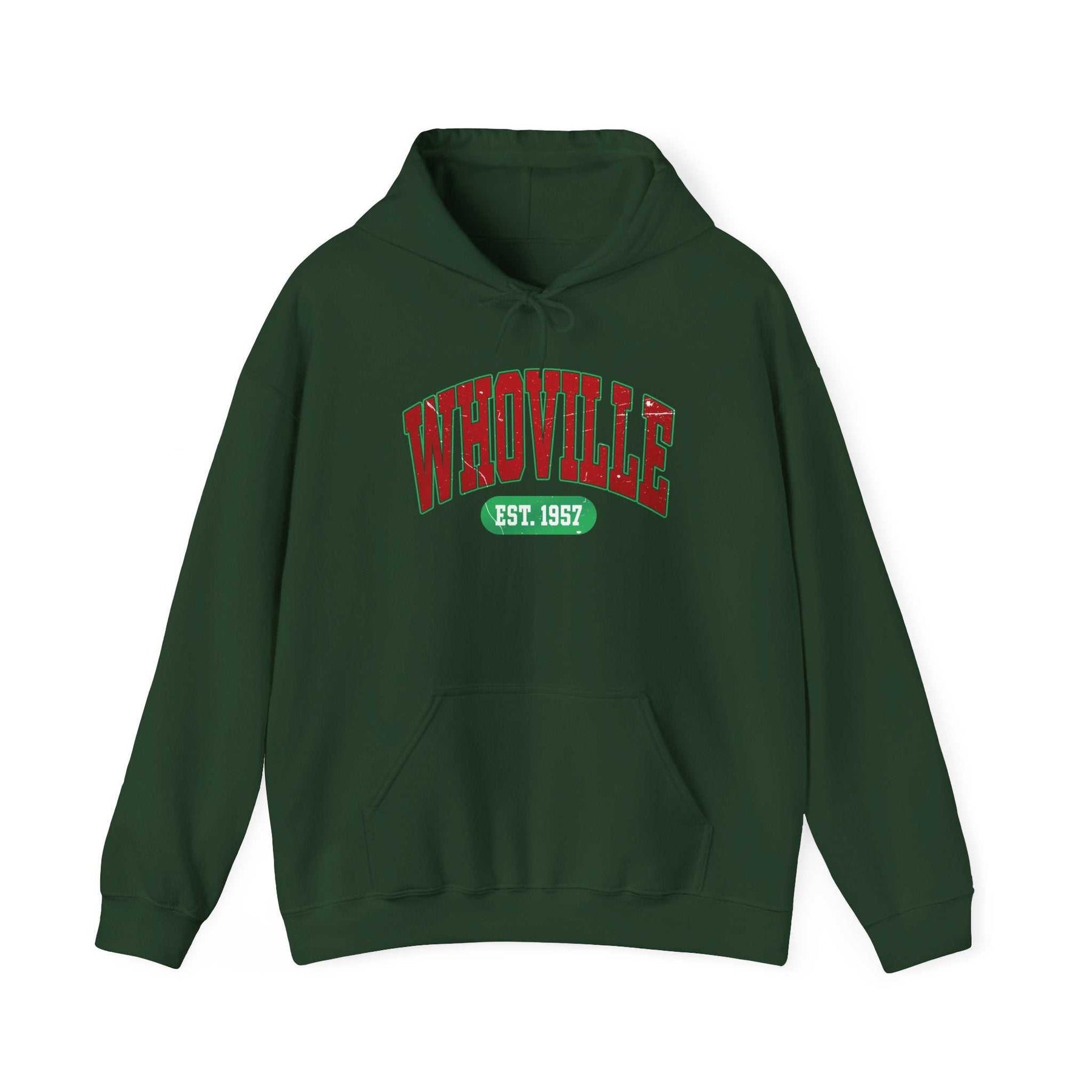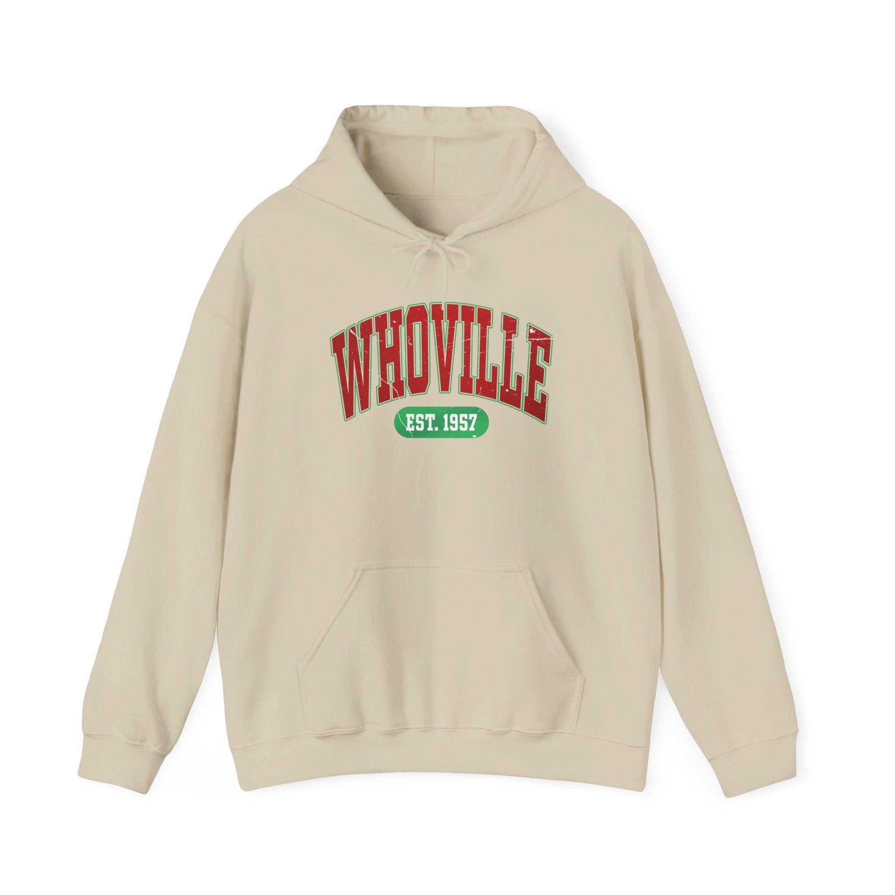 The Whoville- Hoodie is a unisex heavy blend hooded sweatshirt is relaxation itself. The material is a thick blend of cotton and polyester. This makes for a plush, soft feel alongside warmth. It's also a great surface for printing. There are no side seams. A spacious kangaroo pocket hangs in front. The hood's drawstring is the same color as the base sweater.