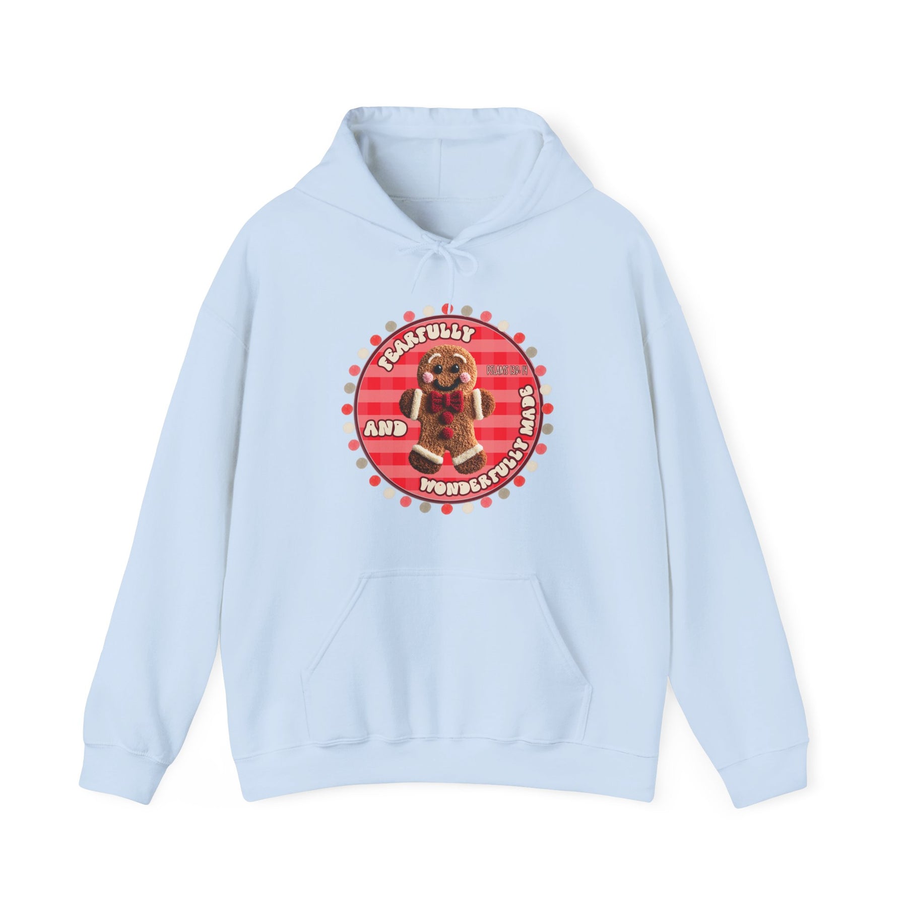 Wonderfully Made Hoodie featuring a gingerbread-man graphic with Fearfully and Wonderfully Made text, Psalm 139:14 reference on a light-blue pullover.